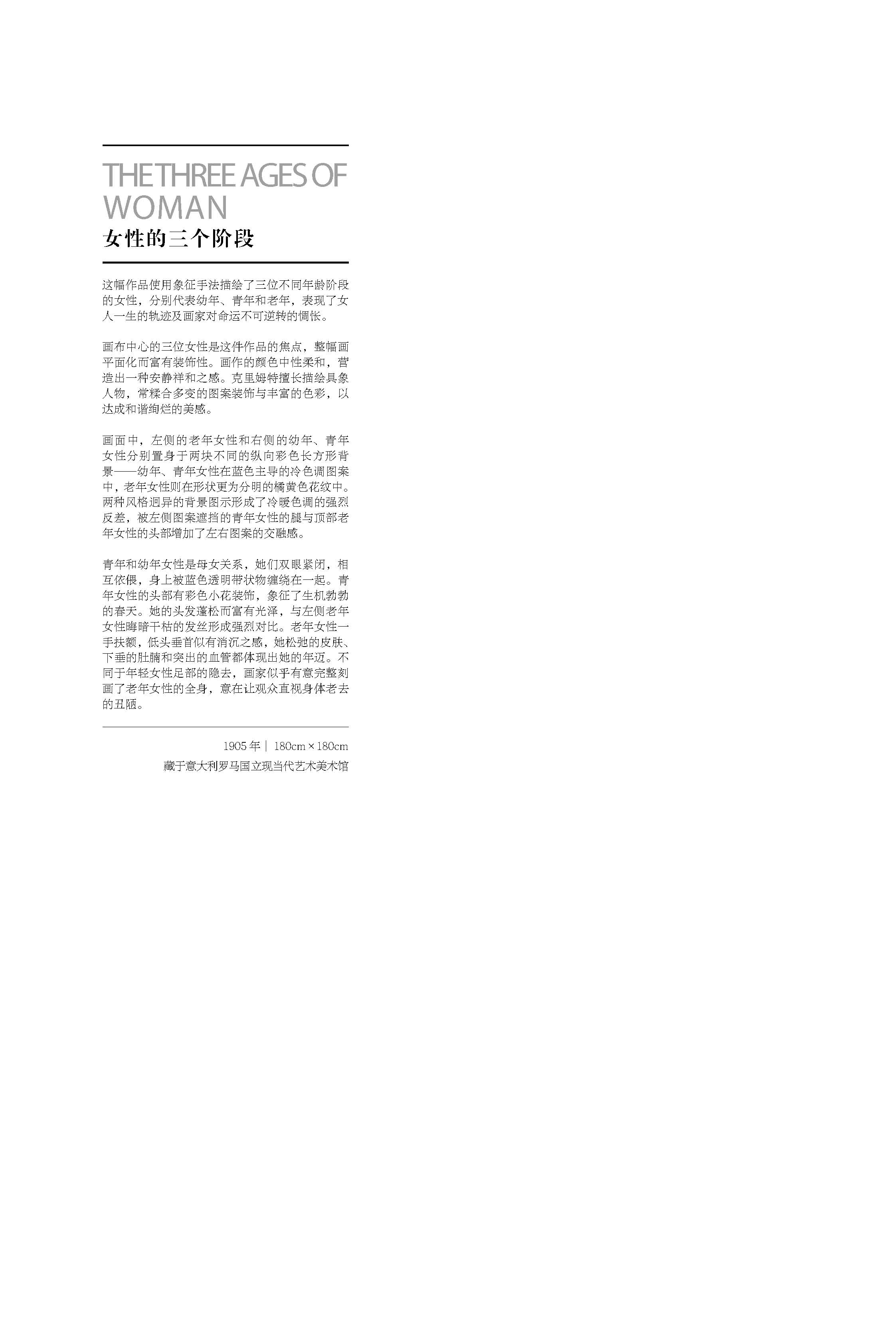 這本畫冊(cè)精選克里姆特的《吻》《生命之樹》《金魚》《女人的三個(gè)階段》等32幅著名的油畫作品,為拉近讀者與大師的距離,本系列所挑選大師作品力求經(jīng)典。作品選擇內(nèi)容豐富、題材健康、色調(diào)明快、色塊清晰。從而達(dá)到受眾人群廣,從學(xué)生到美術(shù)愛好者,甚至美術(shù)培訓(xùn)機(jī)構(gòu),包括成人和兒童。裝幀形式更便于臨摹學(xué)習(xí)和室內(nèi)空間裝飾,用途廣泛。精美的封盒設(shè)計(jì)、考究的用紙以及高品質(zhì)、高清的印刷也為提升本系列畫帖的品質(zhì)的必要條件。