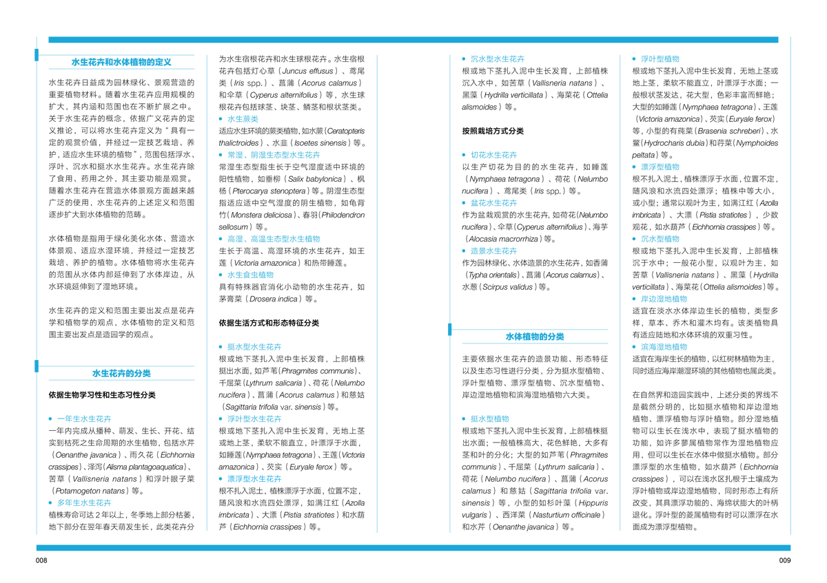 《水體植物景觀》按照植物的特性和景觀功能分類(lèi),分為挺水型植物造景、浮葉型植物造景、漂浮型植物造景、沉水型植物造景、岸邊濕地植物造景、濱海濕地植物造景,方便園林從業(yè)人員在實(shí)際應(yīng)用中參考借鑒。