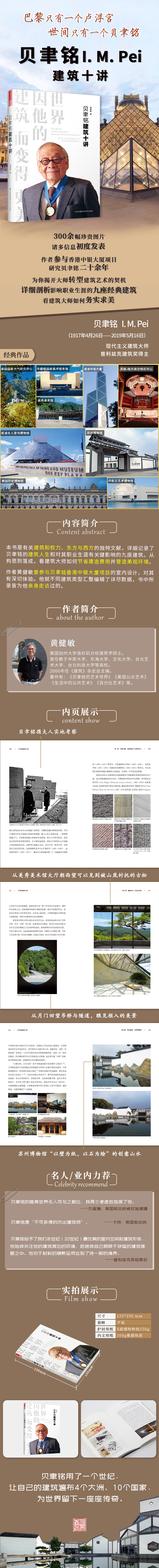 作者黃健敏追蹤建筑大師貝聿銘的建筑人生,收錄的九座建筑皆為他親身走訪過的,如香港中銀大廈、桃源鄉(xiāng)記——美秀美術(shù)館、蘇州博物館等膾炙人口的經(jīng)典之作。全書十萬余字,圖片三百余幅,諸多信息為首度發(fā)表。這是一本有關(guān)建筑物和權(quán)力、移民和同化、美式奔放和中式收斂、東方和西方的傳記。他用了一個(gè)世紀(jì),讓自己的建筑遍布4個(gè)大洲、10個(gè)國(guó)家,為世界留下一座座傳奇建筑。