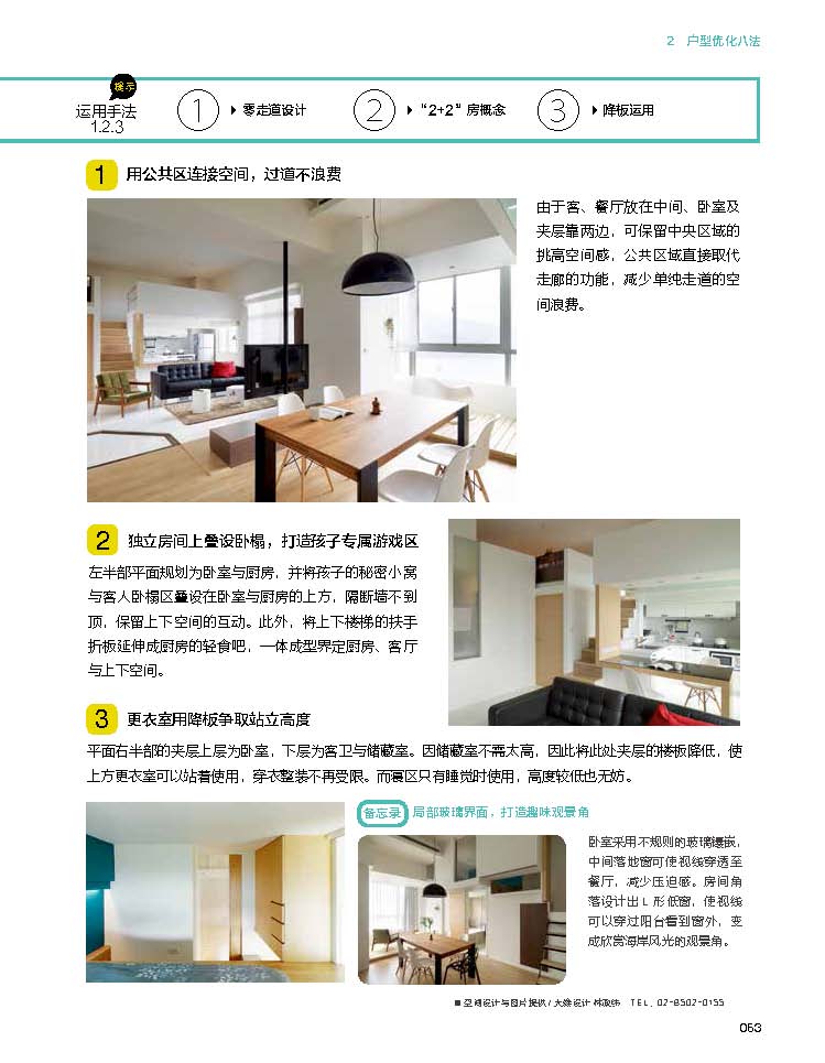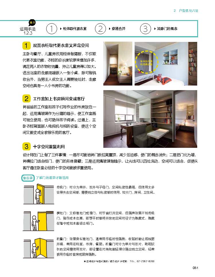 有了初步概念后,再分門別類講解,從空間、家人愉快相處、生活動線、特殊功能、通風(fēng)采光、收納計(jì)劃、家庭娛樂休閑及空間心理學(xué),8大不可不知的戶型優(yōu)化手法。