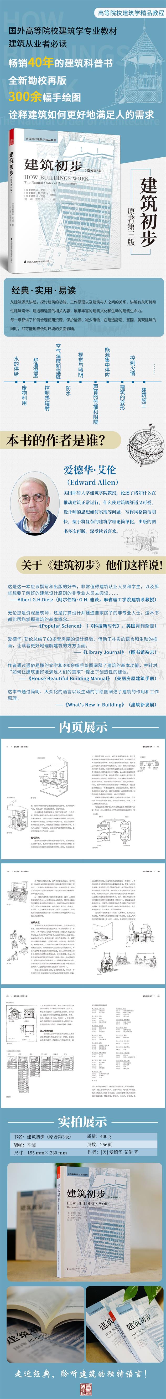 愛德華·艾倫的寫作風格簡潔明快,能將復雜的建筑學理論簡單化,本書具有很強的實用性和借鑒性。無論經驗豐富的建筑學教師、建筑從業者,還是建筑學專業的學生,都能從《建筑初步》中得到啟發。