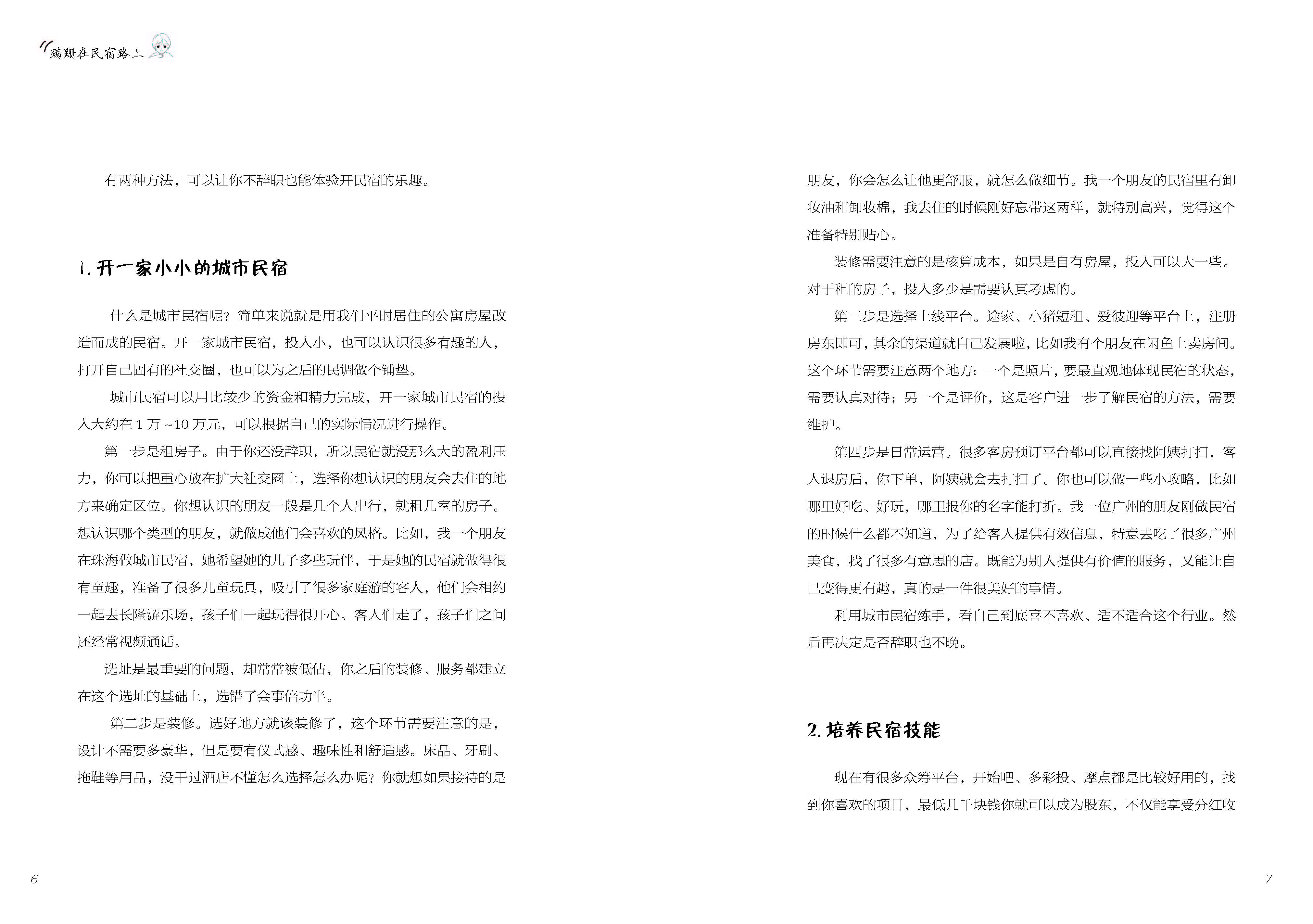 本書是作者經(jīng)營民宿六年的心血之作,全書分為七章,分別從前期規(guī)劃、資金籌措、選址設(shè)計、客源、運營、品牌建設(shè)、經(jīng)驗總結(jié)等方面總結(jié)了作者開民宿的經(jīng)驗。開民宿的過程,也是作者自我學習和成長的過程,曾經(jīng)被施工隊故意加項拖延工期、被合作伙伴騙錢、被對手公司挖角......六年的民宿之路,讓作者從一個初入社會的小女生變成了一個八面玲瓏、面對任何難題都游刃有余的女漢子。作者真誠的寫出了自己民宿之路上的種種經(jīng)歷,為廣大民宿經(jīng)營者提供了前車之鑒,防止后來人再入陷阱。