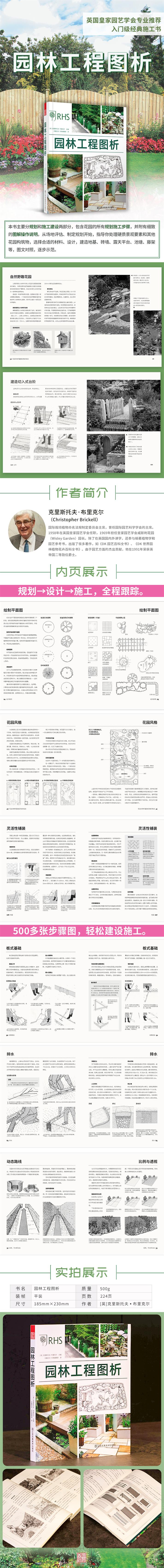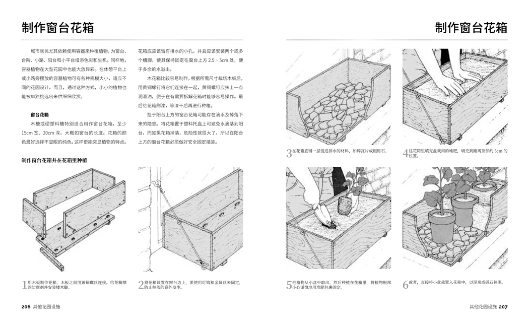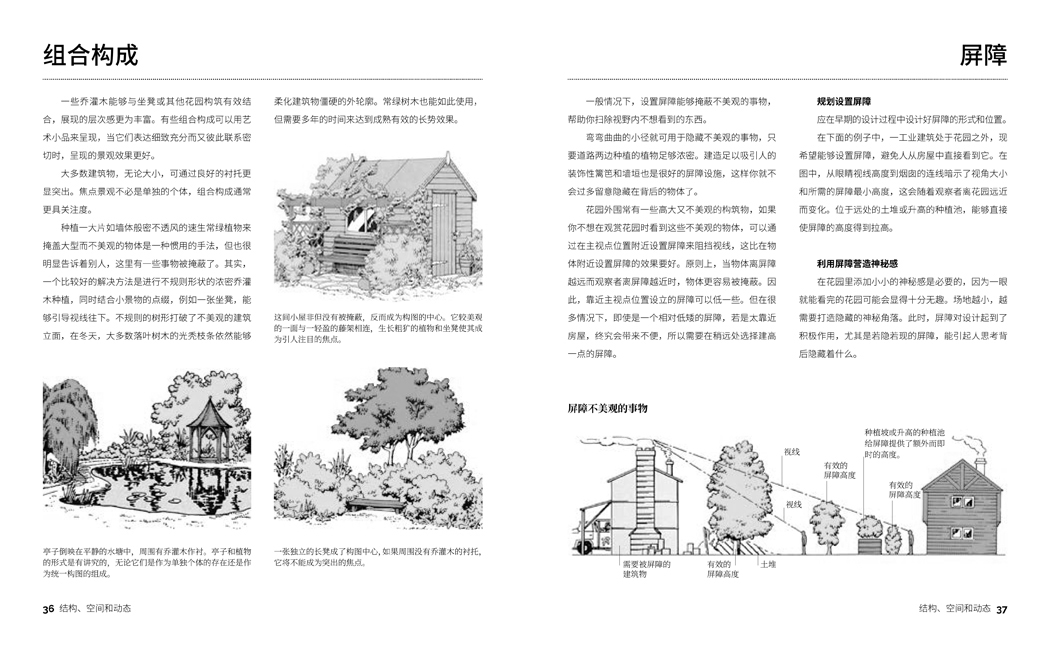書中內(nèi)容主要分為兩大部分——規(guī)劃與施工建設。第一部分是由打造花園首先需進行的工作入手,對場地進行調(diào)查和全方位評估,制定花園規(guī)劃;第二部分是關于如何處理硬質景觀要素和其他花園構筑物,指導我們選擇合適的材料和設計,例如園路鋪面的鋪設方法,如何建造地基、磚墻、露天平臺、池塘和藤架等。