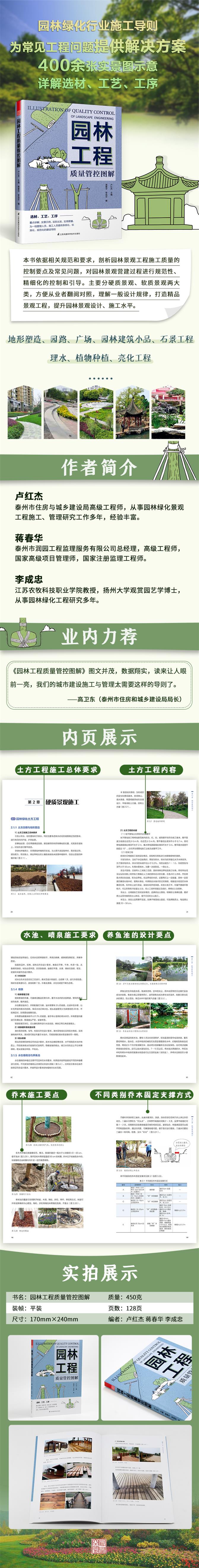 本書充分運(yùn)用實(shí)踐中的案例圖片,從選材、施工工藝、工序等方面,依據(jù)相關(guān)規(guī)范和要求,從感觀效果上剖析園林景觀工程施工質(zhì)量的控制要點(diǎn)及常見問題。以硬質(zhì)景觀、軟質(zhì)景觀作為園林工程的兩大分類,逐一剖析各項(xiàng)施工的設(shè)計(jì)和施工質(zhì)量要求,展示常見工程問題,方便相關(guān)從業(yè)人員在工程進(jìn)行過程中隨時(shí)翻閱對(duì)照。
