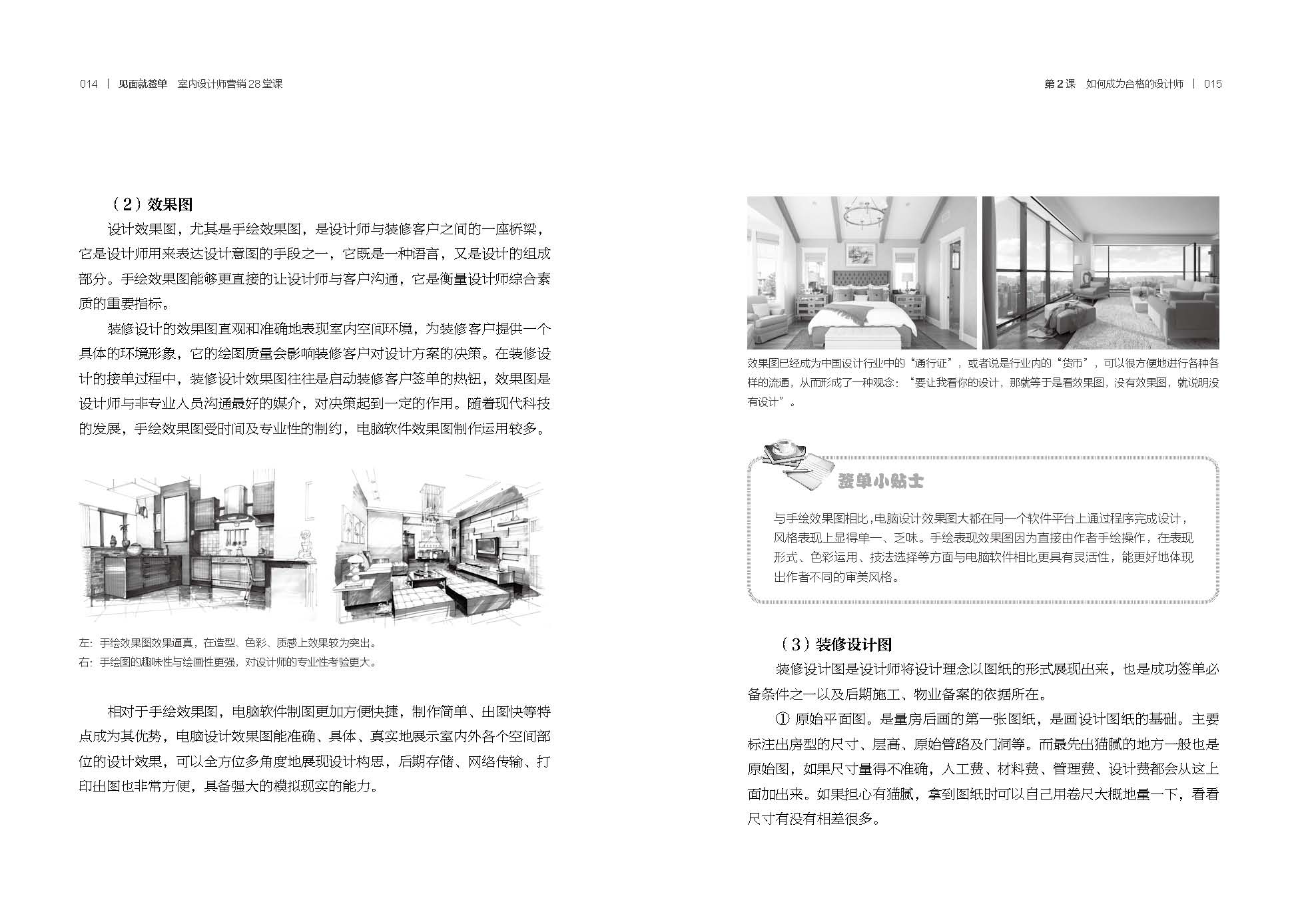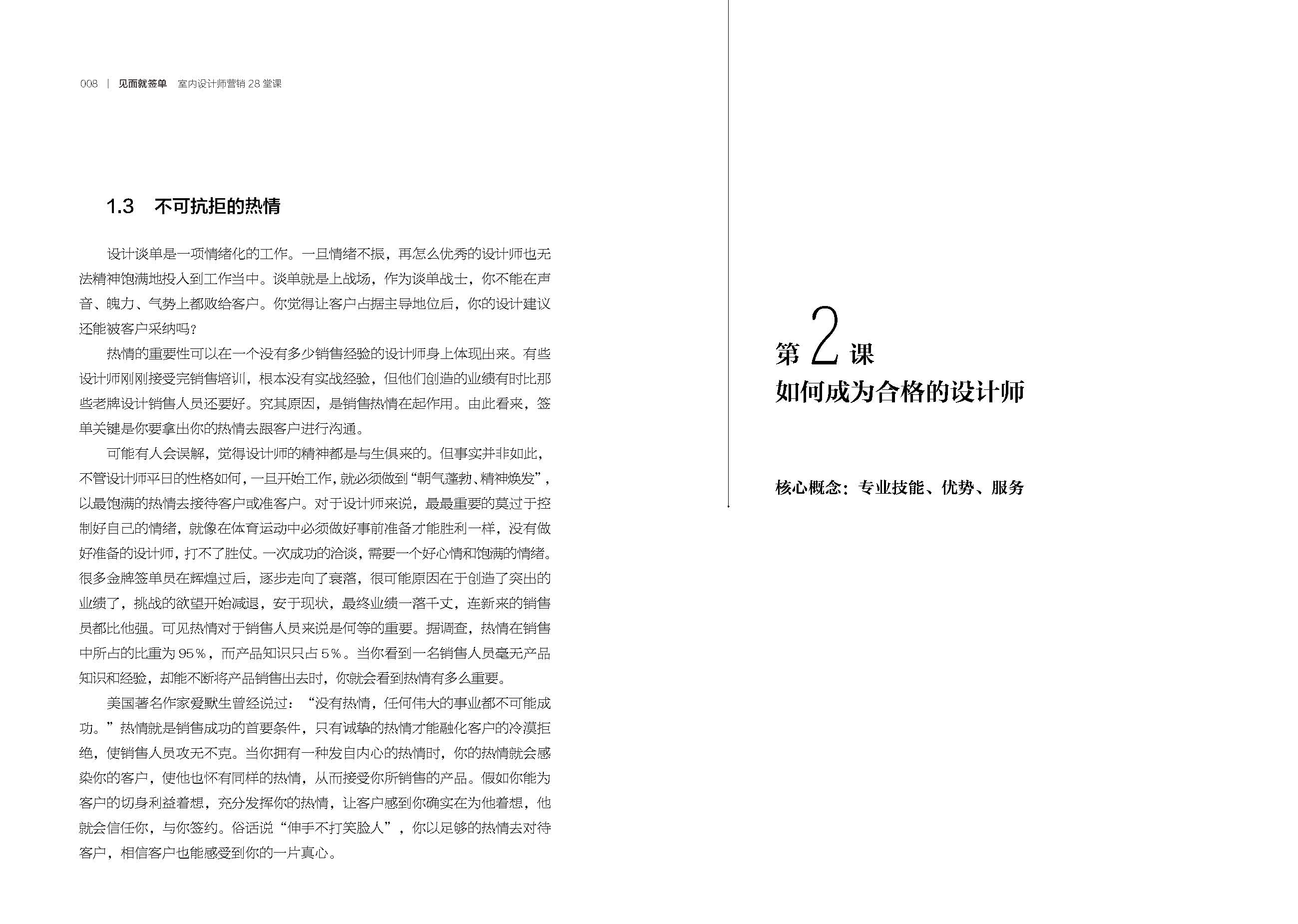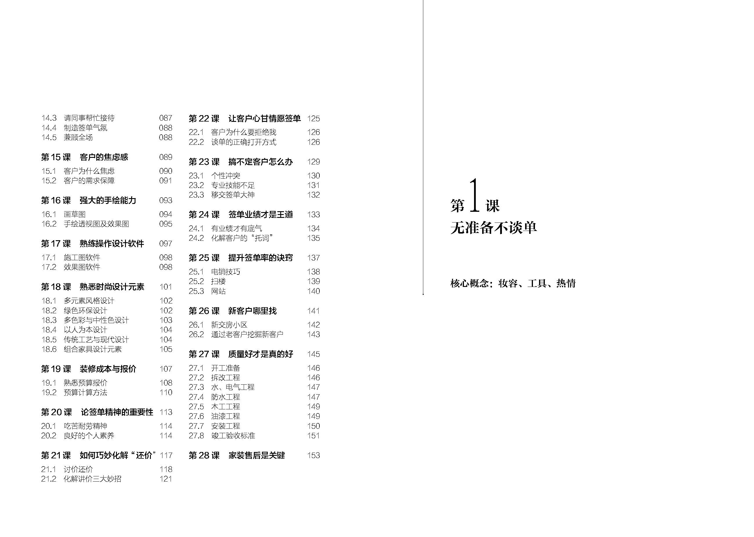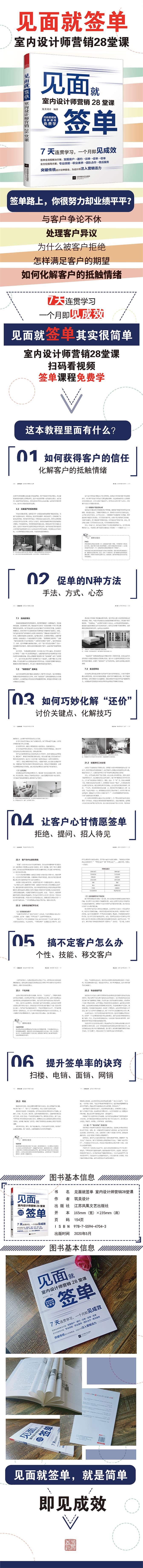 簽單,是每個(gè)設(shè)計(jì)、裝修行業(yè)從業(yè)者最重視的環(huán)節(jié),但一個(gè)簡(jiǎn)單的詞語后面,是諸多細(xì)節(jié)和實(shí)力的體現(xiàn),設(shè)計(jì)師要具有的技能、各環(huán)節(jié)要注意的細(xì)節(jié)、與客戶交流溝通的技巧、合作結(jié)束后關(guān)系的維護(hù)等等,都是影響能否簽單的關(guān)鍵因素。本書總結(jié)了影響簽單的28個(gè)關(guān)鍵點(diǎn),詳細(xì)介紹了每個(gè)關(guān)鍵點(diǎn)設(shè)計(jì)師應(yīng)該如何做才能促成簽單。每一步都簡(jiǎn)單易懂,操作性強(qiáng),是家裝行業(yè)新人進(jìn)階不可或缺的指導(dǎo)手冊(cè)。