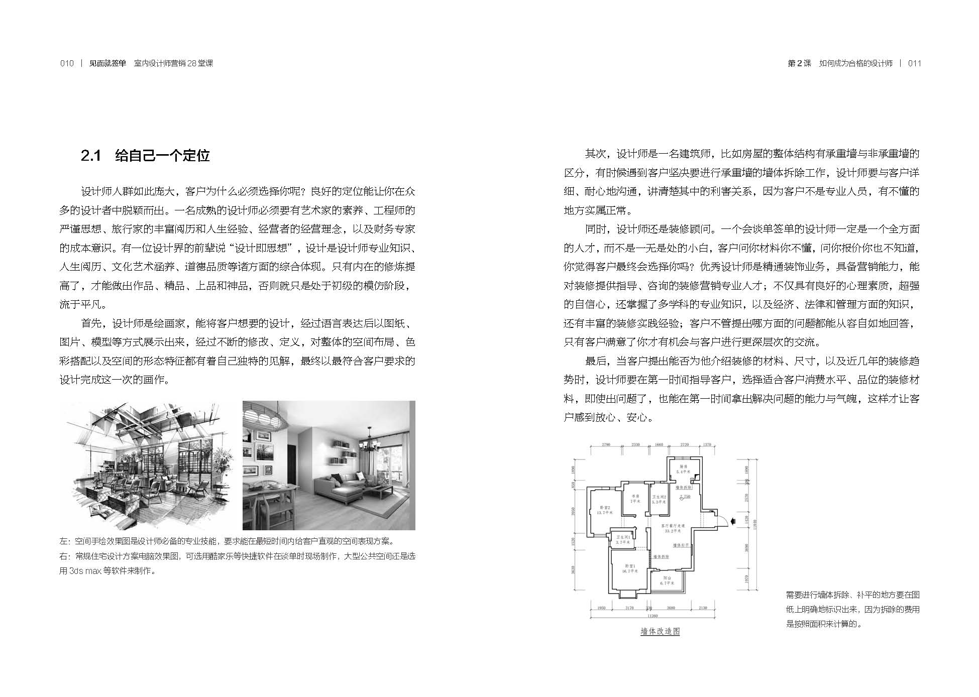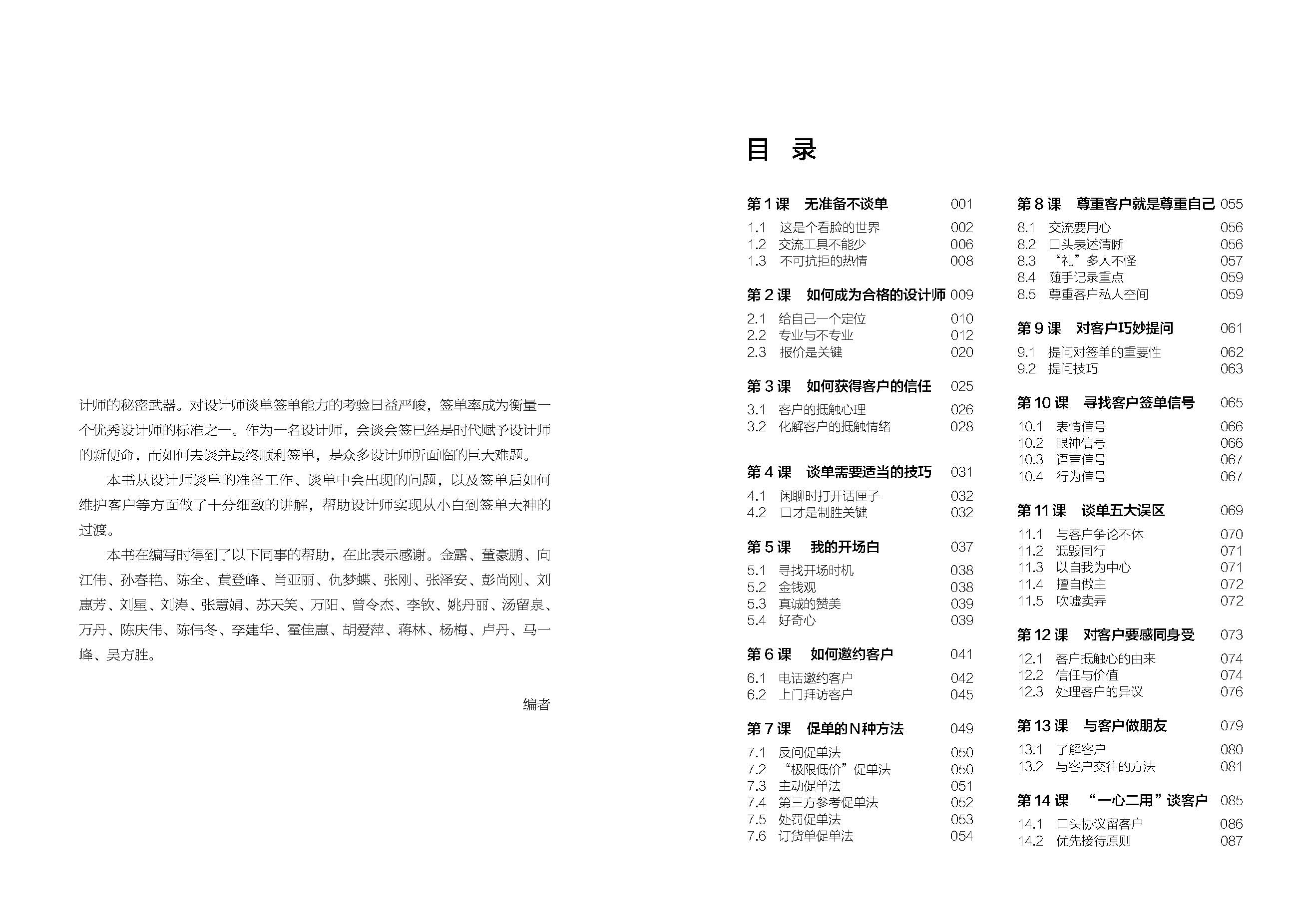 本書從設(shè)計(jì)師談單的準(zhǔn)備工作、談單中會(huì)出現(xiàn)的問題,以及簽單后如何維護(hù)客戶等方面做了十分細(xì)致的講解,幫助設(shè)計(jì)師完成從小白到簽單大神的過渡。