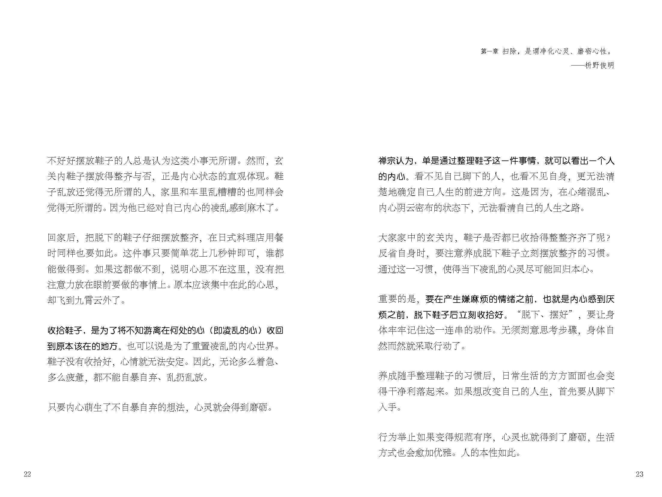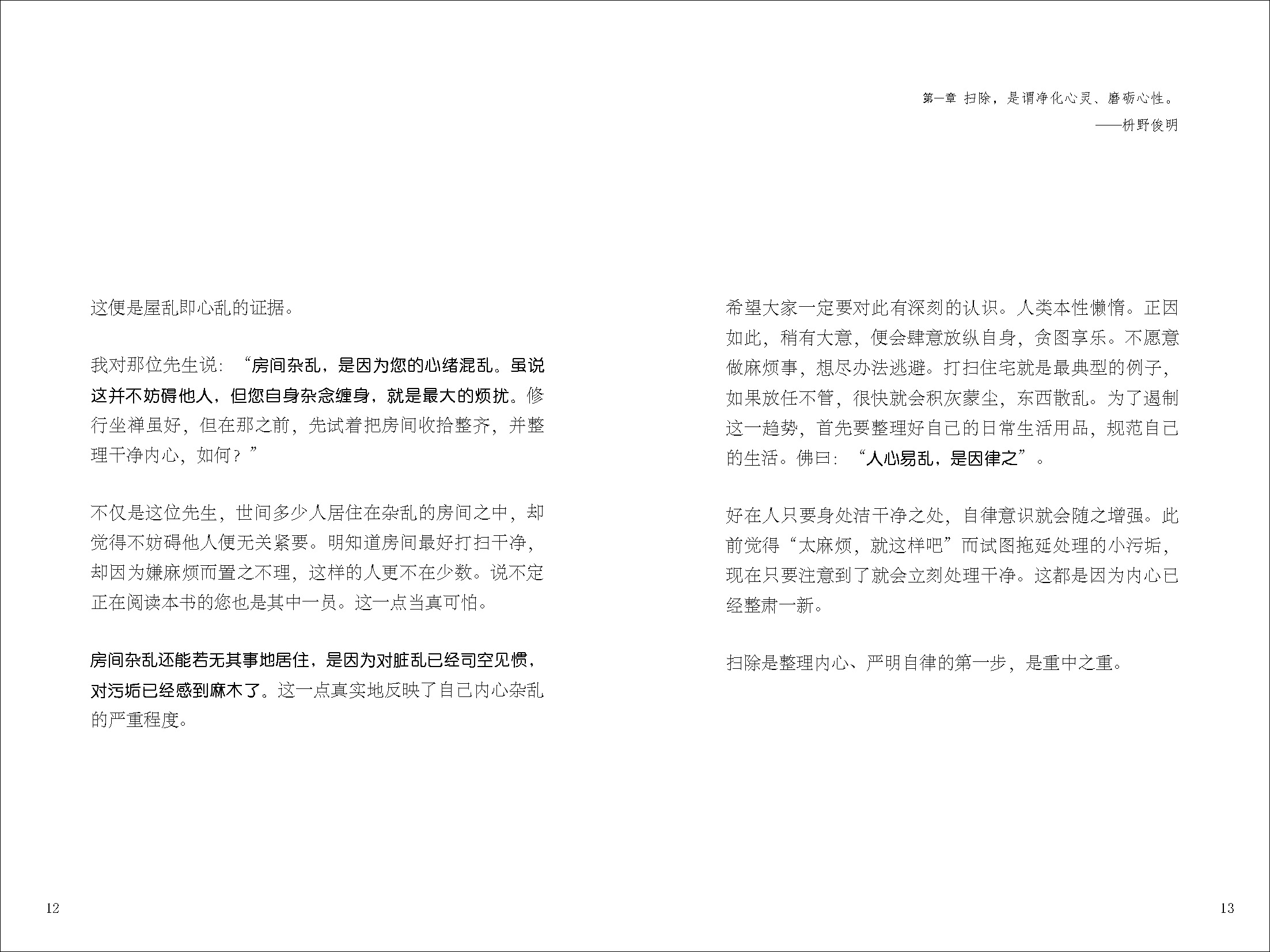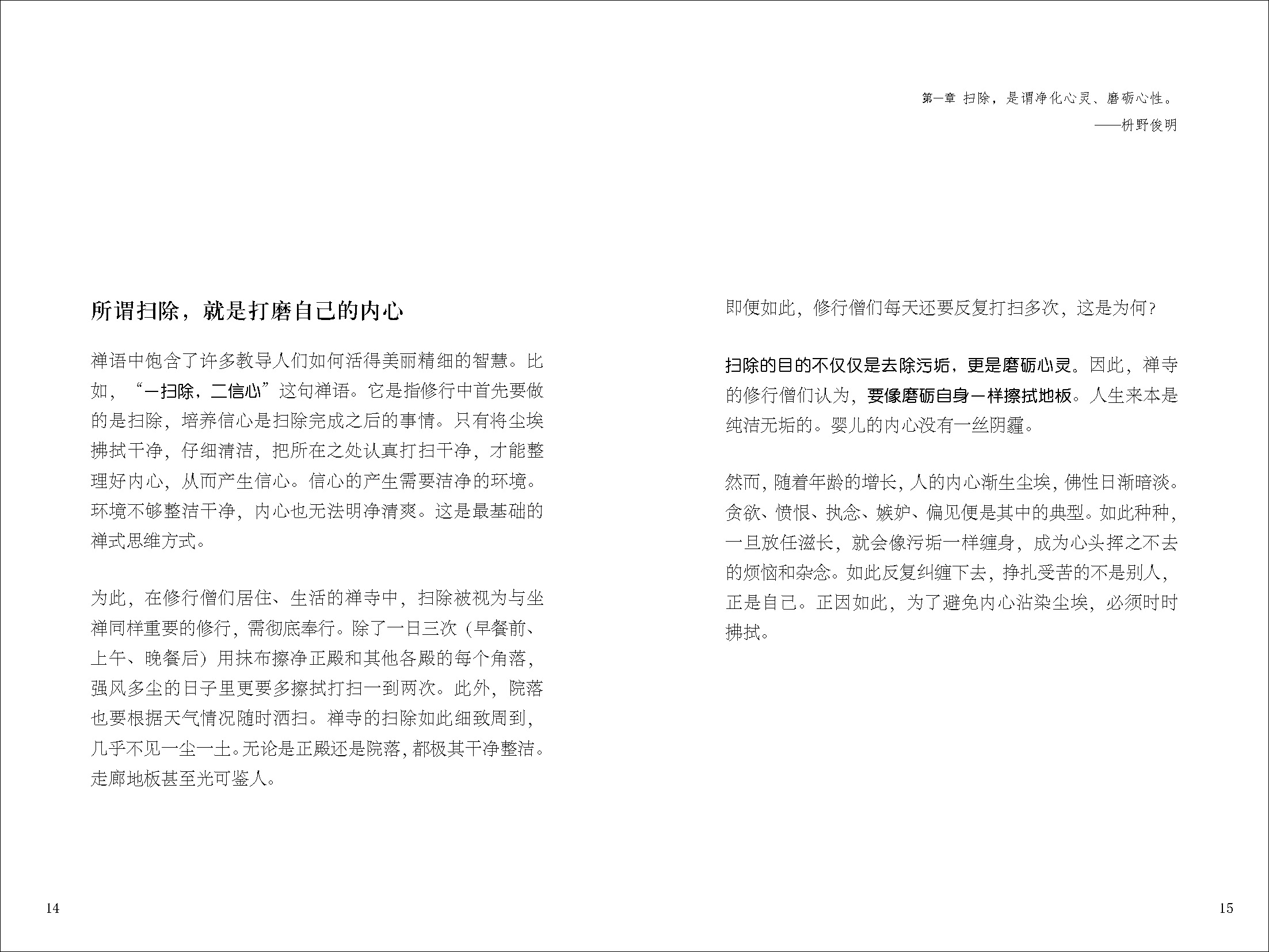 本書(shū)作者為日本禪學(xué)大師枡野俊明和掃除專家沖幸子,將禪學(xué)中掃除的智慧和歐洲極簡(jiǎn)整理術(shù)相結(jié)合,內(nèi)容共分為三章:第一章,枡野俊明分享掃除與調(diào)和心靈的作用,即通過(guò)打掃外部環(huán)境來(lái)整理內(nèi)心,去除不必要的執(zhí)著和雜亂的心緒;第二章,沖幸子分享許多實(shí)用整理術(shù)及歐洲經(jīng)驗(yàn),她指出掃除困難的原因是物品太多,進(jìn)而講述舍棄物品的準(zhǔn)則;第三章,枡野俊明與沖幸子對(duì)談,融合東西雙方關(guān)于掃除的觀點(diǎn)與訣竅,意在使讀者珍惜現(xiàn)有的一切,回歸豐饒的初心,獲得清爽簡(jiǎn)單的生活。