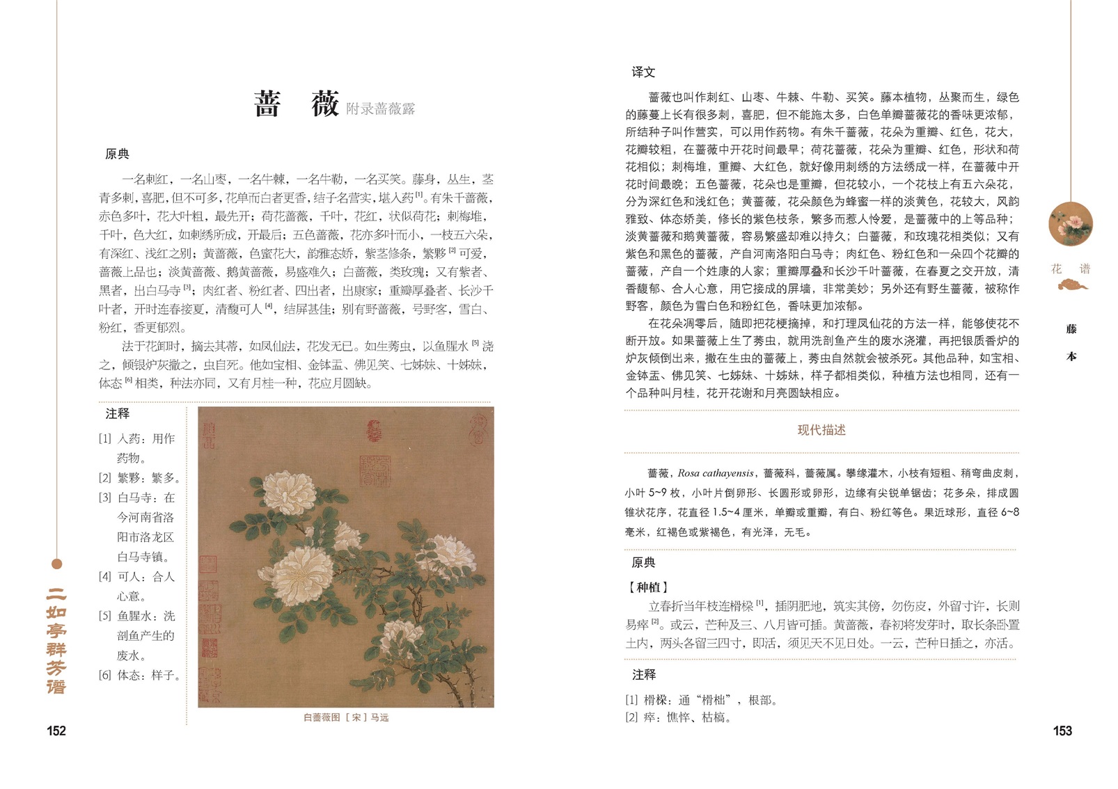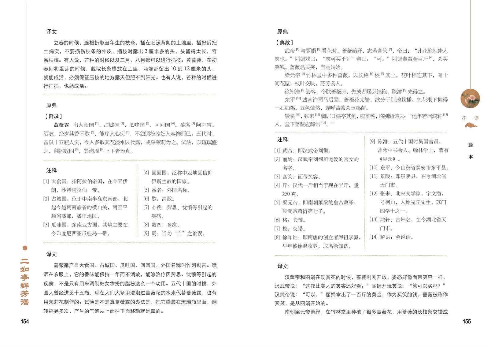 因原書體量過大,本書選取了與園林觀賞相關的花、卉、鶴、魚四譜,篇幅以植物為主,旨在古代植物文化的普及。除原文注譯外,配以相應植物的古代名畫,增加現(xiàn)代植物分類學描述等,幫助讀者更好地認識植物,體悟古人看待植物的視角,呈現(xiàn)豐富有趣的植物文化。考慮到篇幅和閱讀效果,對原書詩歌、中藥方的內(nèi)容進行了刪減。