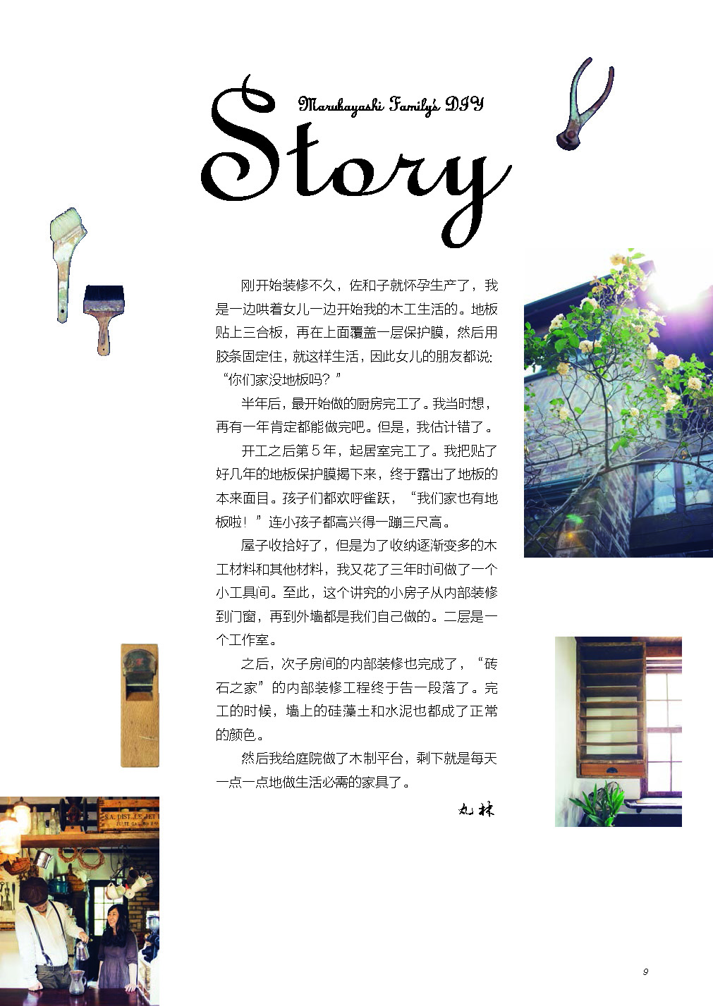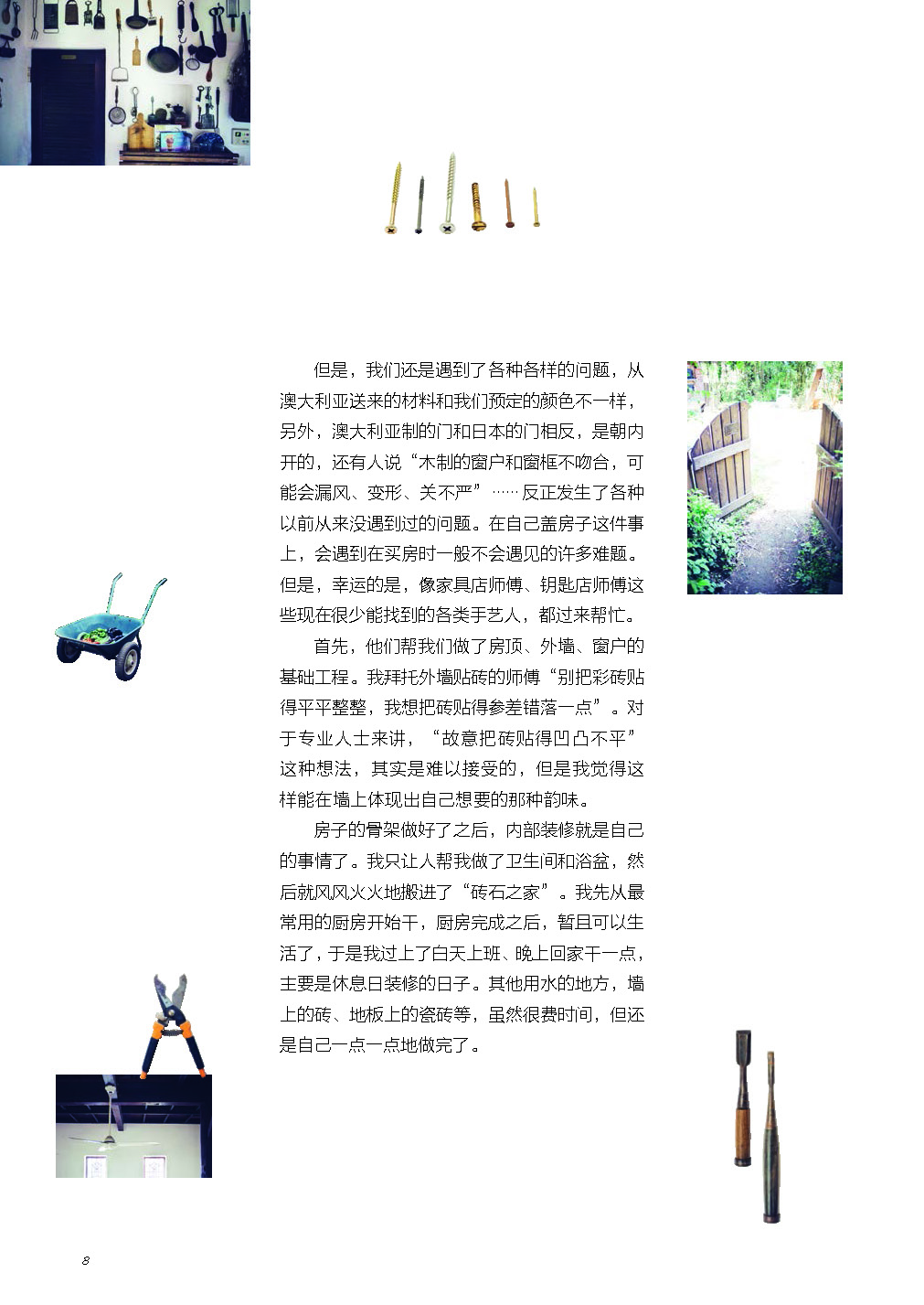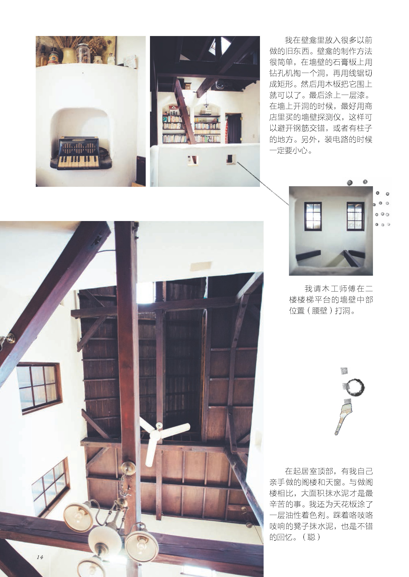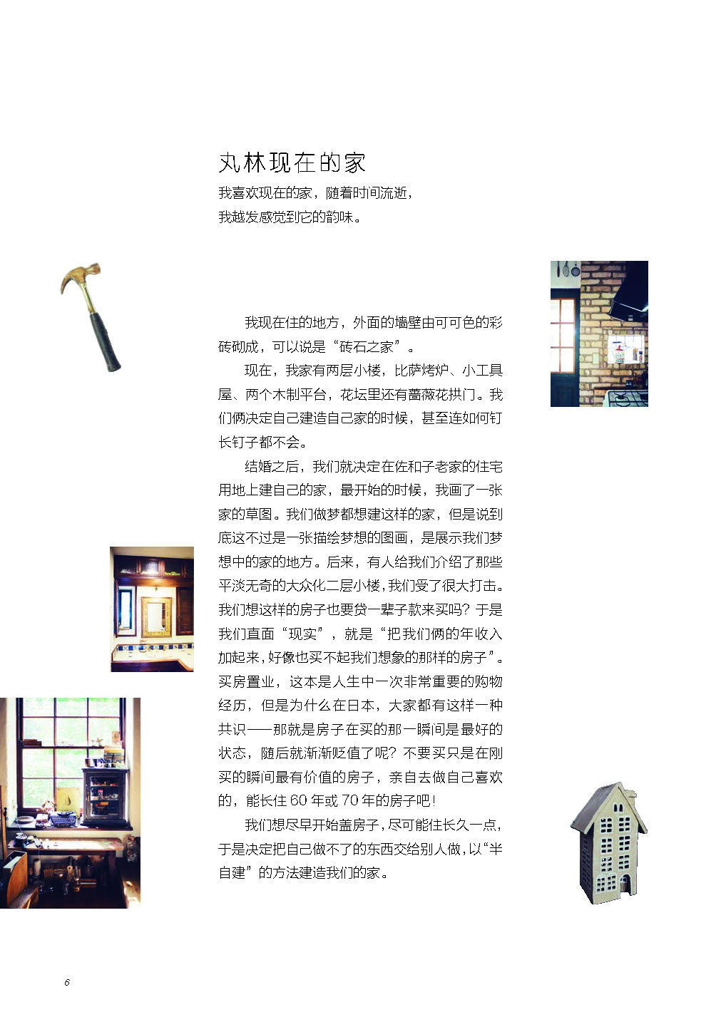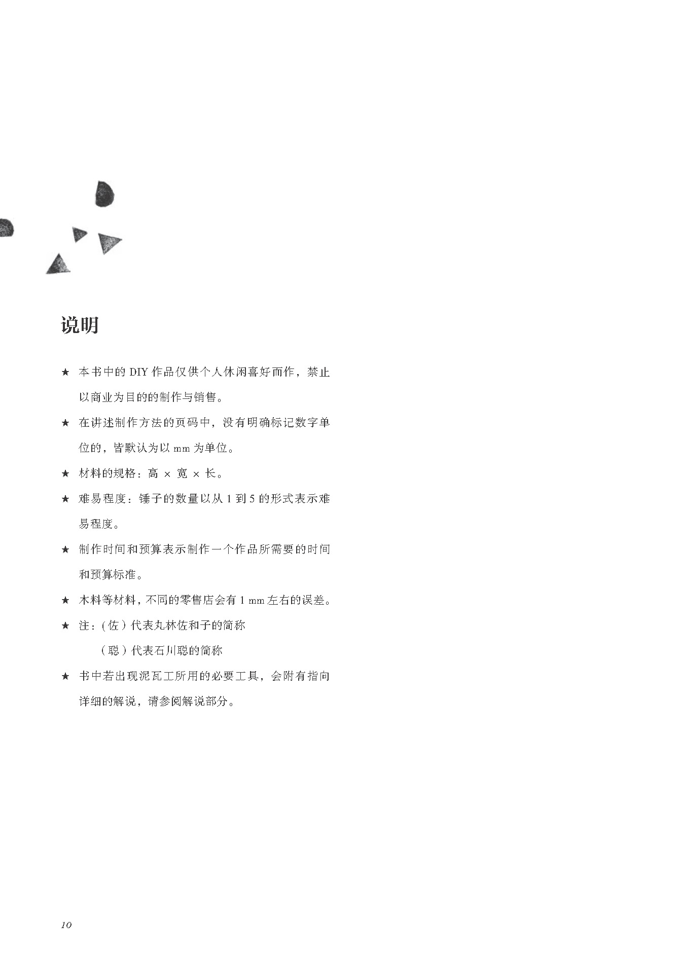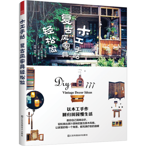 用木制托盤制作的圓凳、寬面隔斷、三層小花架、復(fù)古風(fēng)小水族箱、用紅酒盒改裝的儲(chǔ)物架等;第二章是貼上方形小瓷磚的調(diào)料架、桌上看書(shū)架、柔和的舊木材和皮革做成的托盤等;第三章是用裝飾線條做的小黑板、紙張收納架、紙帶收納架、收納空間充足的木閣樓等;第四章是大家都能蓋好的前廊、枕木和磚頭砌成的臺(tái)階、樸素的葡萄架、兩種銹鐵皮屋頂鳥(niǎo)窩等;第五章是木工基礎(chǔ)。書(shū)中實(shí)景圖、步驟圖詳細(xì),新手也能很快上手。