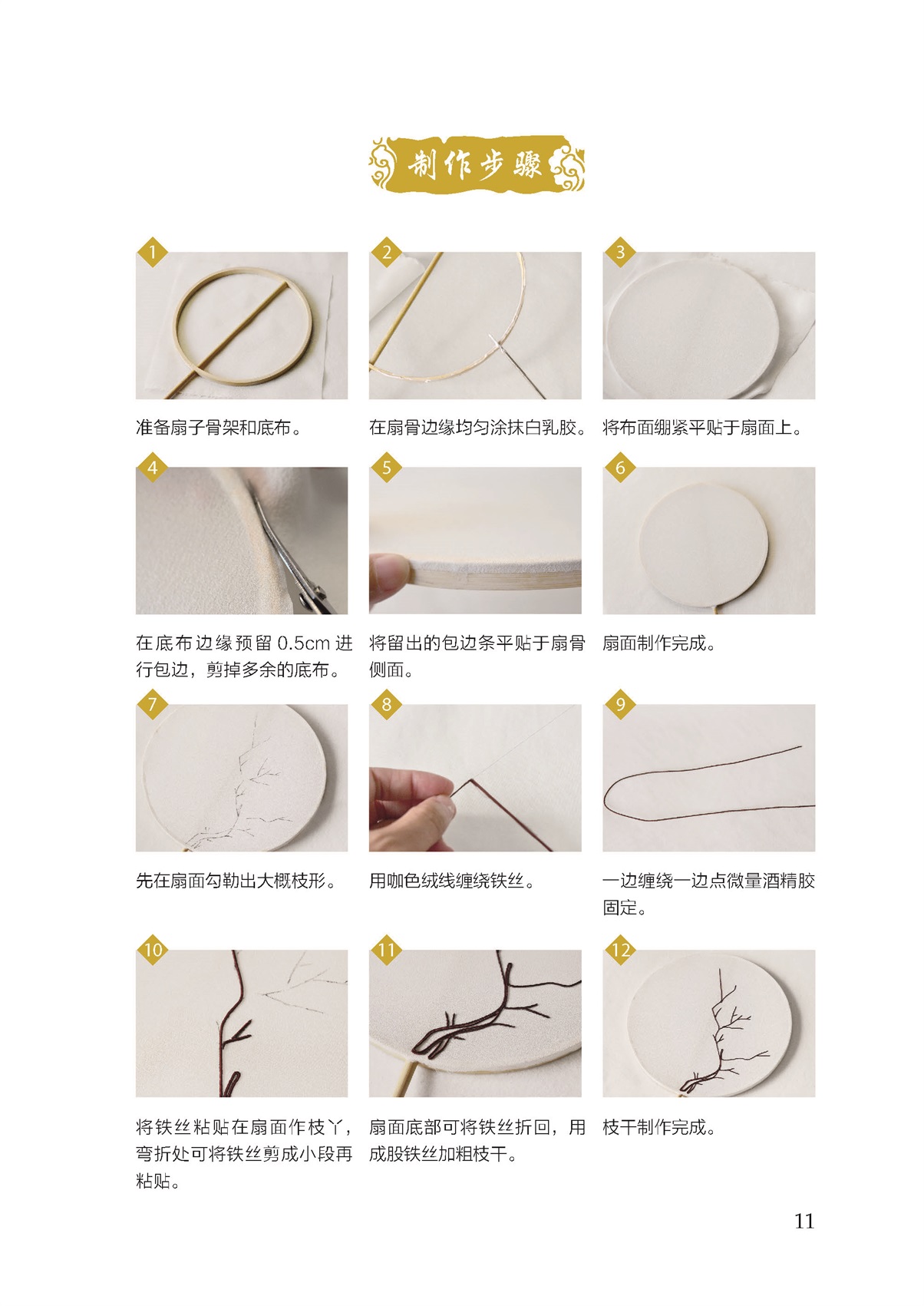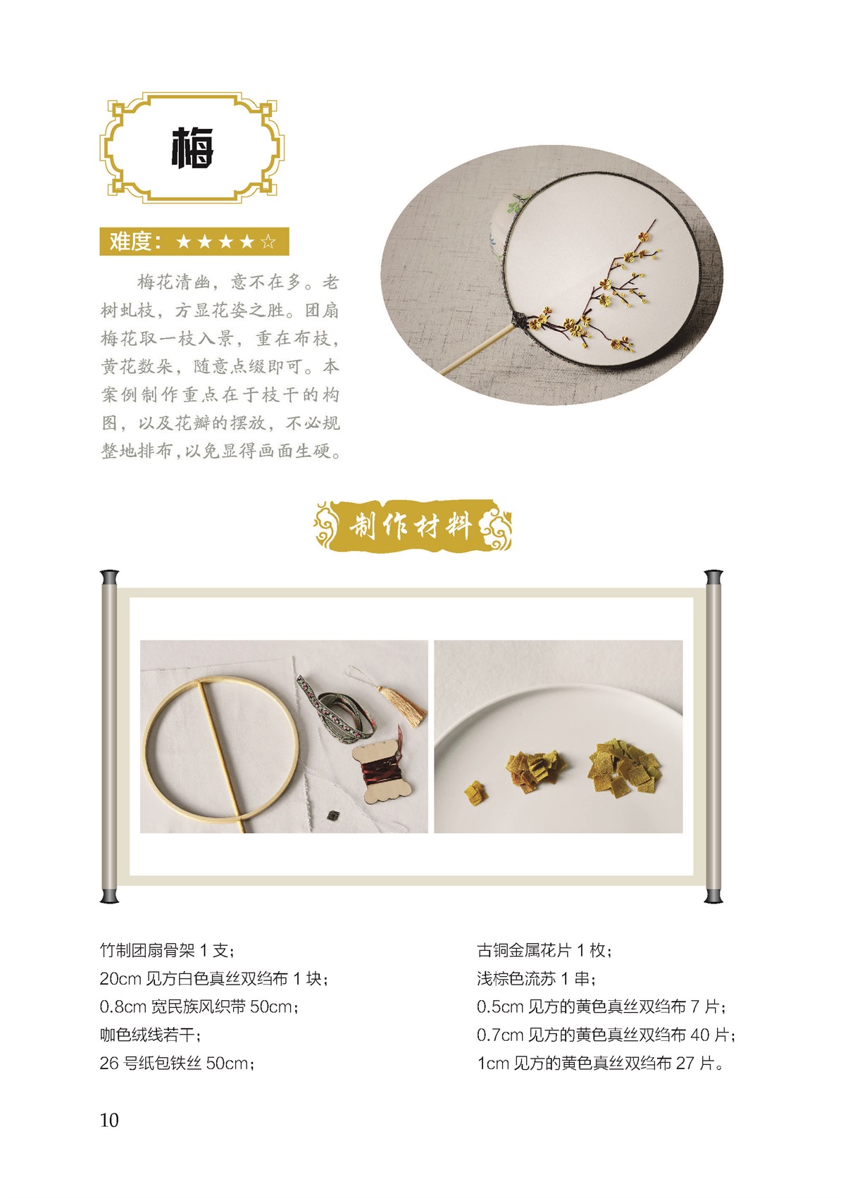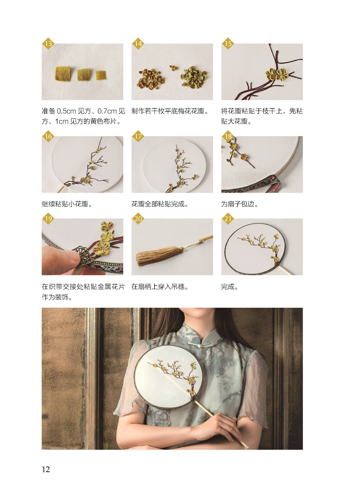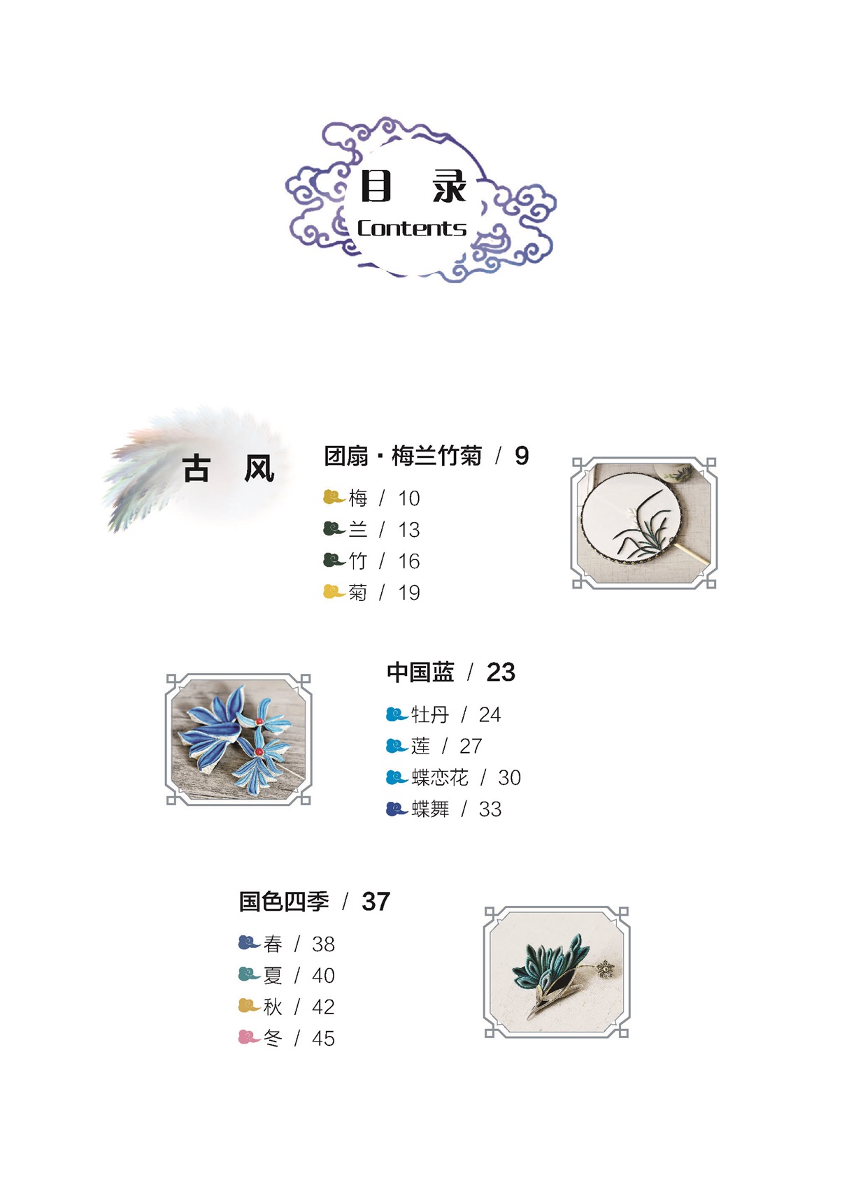 細(xì)工花是起源于日本江戶時代的一種手工藝,主要通過布片的折疊制作形態(tài)各異的花瓣,再將花兒組合成各種飾品。本書介紹了中國風(fēng)與民族風(fēng)的細(xì)工花飾的制作方法,全書共24個案例,分為兩個場景,共六種風(fēng)格,制作技法上則既包含了傳統(tǒng)細(xì)工花技法,同時也有一部分創(chuàng)新的技法。其中,古風(fēng)場景中的團(tuán)扇以中國傳統(tǒng)文化中最有代表性的文化符號——梅、蘭、竹、菊為主題,制作出的細(xì)工花團(tuán)扇形態(tài)優(yōu)美,獨具風(fēng)韻;中國藍(lán)系列作品用深淺不同的藍(lán)色布片,搭配金屬花貼片及天然石、復(fù)古繩結(jié)等配件,突顯中國韻味;國色四季系列作品則以國畫為參照,選取國畫中常用的四種顏色來表現(xiàn)四季之景。古韻場景中的禪意世界系列作品以淺米到深棕的漸變?nèi)旧憩F(xiàn)慈悲和溫情;錦繡年華系列作品以夸張的鎖形、倒三角形等大膽復(fù)古的形狀,搭配小流蘇、玉珠等掛飾,表現(xiàn)出了濃郁的中國風(fēng);色度空間系列作品以跳躍的撞色來表現(xiàn)自由不羈的民族風(fēng),層次感分明。本書對于方法步驟講解詳細(xì),圖解步驟配文字說明,讀者一看就會。