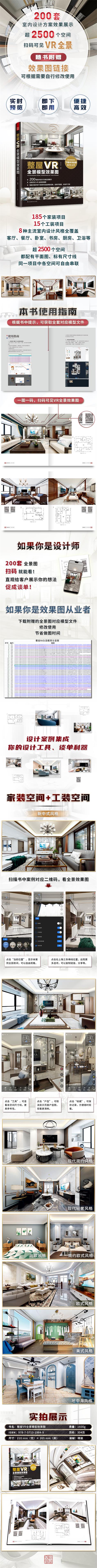 本書中展示的是用酷家樂軟件制作的 200套室內設計效果圖,其中有家裝 185 套、工裝 15 套,涵蓋了目前室內設計中應用最多的新中式、現代簡約、現代輕奢、北歐、簡約歐式、歐式、美式、地中海 8 種風格。每套效果圖里面各自都包含多個空間,有客廳、餐廳、臥室、書房、廚房、衛浴等,全部以 VR 全景的模式展現,各空間之間可以自由串聯。