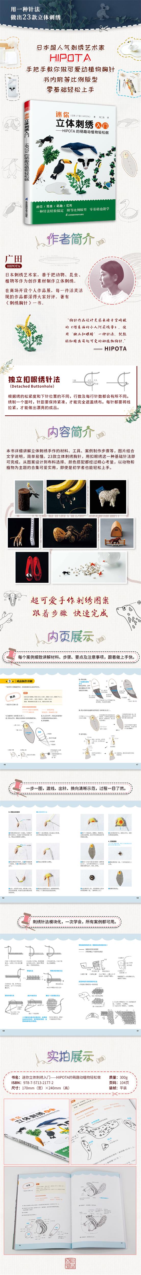 《迷你立體刺繡入門——HIPOTA的萌趣動植物輕松做》這是一本刺繡入門的生活手工類書籍。以日本動畫大師宮崎駿《借東西的小人阿莉埃蒂》為靈感創(chuàng)作的迷你立體刺繡。本書的特點是將復(fù)雜的刺繡簡約化,手法簡單易懂,簡單的刺繡針法就可在較短的時間內(nèi)做出一幅精美的動植物小掛件。全書分為三部分內(nèi)容,第一部分成品圖展示,第二部分工具介紹,第三部分為詳細(xì)制作步驟及版型圖。本書介紹了23件精美可愛的案例制作方法,都配有詳實的步驟圖片介紹。配合文字說明簡單易懂,圖案以動物和植物為主題的大合集。原大紙型、原大圖案、簡單的配色和基礎(chǔ)針法,即使是初學(xué)者也可輕松上手。作品實用性強;用扣眼繡一種基礎(chǔ)針法即可完成。