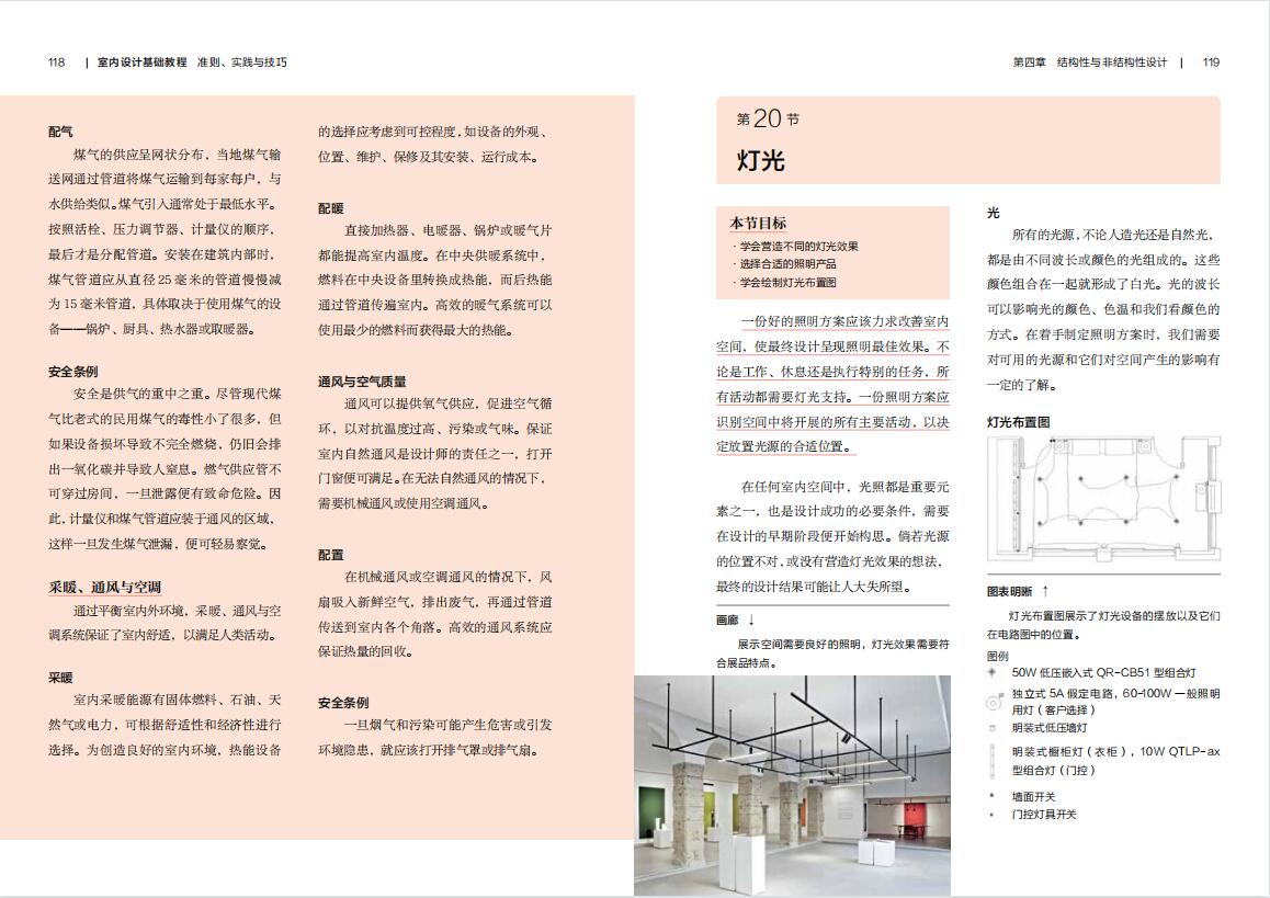 如果你是一名設(shè)計(jì)專業(yè)的學(xué)生,那么翻開(kāi)本書(shū)就像翻開(kāi)一本標(biāo)準(zhǔn)意義上的教材。這本書(shū)從設(shè)計(jì)基本功講起,教你如何構(gòu)思、如何用筆畫出想法,用常見(jiàn)的材料以及軟件輔助做出模型,之后便進(jìn)階到設(shè)計(jì)項(xiàng)目,將客戶的想法落地是這階段的重中之重,而與客戶溝通便要借助概念版與模型草樣以及設(shè)計(jì)師良好的表達(dá)能力。在項(xiàng)目施工階段,結(jié)構(gòu)性與非結(jié)構(gòu)性設(shè)計(jì)關(guān)乎建筑組件、材料、水電氣施工、照明、室內(nèi)配色等方方面面。最后,本書(shū)專辟一章,教授“準(zhǔn)設(shè)計(jì)師”們?nèi)绾谓⒆约旱穆殬I(yè)檔案,為求職、簽單做好充足的準(zhǔn)備。