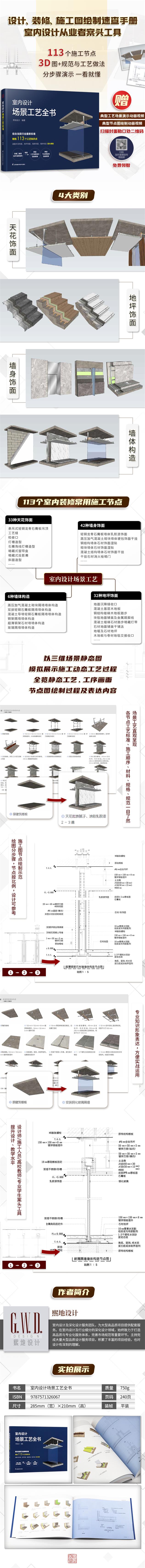 全書包含天花飾面篇、地坪飾面篇、墻身飾面篇、墻體構造篇四大類別,共計113個室內裝修關鍵且常用的施工節點。為方便讀者閱讀,全書采用一個節點一個左右頁對應編排的形式展現,左手頁以直觀的3D圖展示各節點工藝標準、施工順序、材料、規格及規范,身臨其境,通俗易懂;右手頁對該節點的施工圖繪制過程和標準進行展示,入門新手也能一看即懂。有效解決了從業人員缺乏工地現場經驗、高品質標準項目經驗、深化設計經驗以及節點圖紙繪制規范等難題。