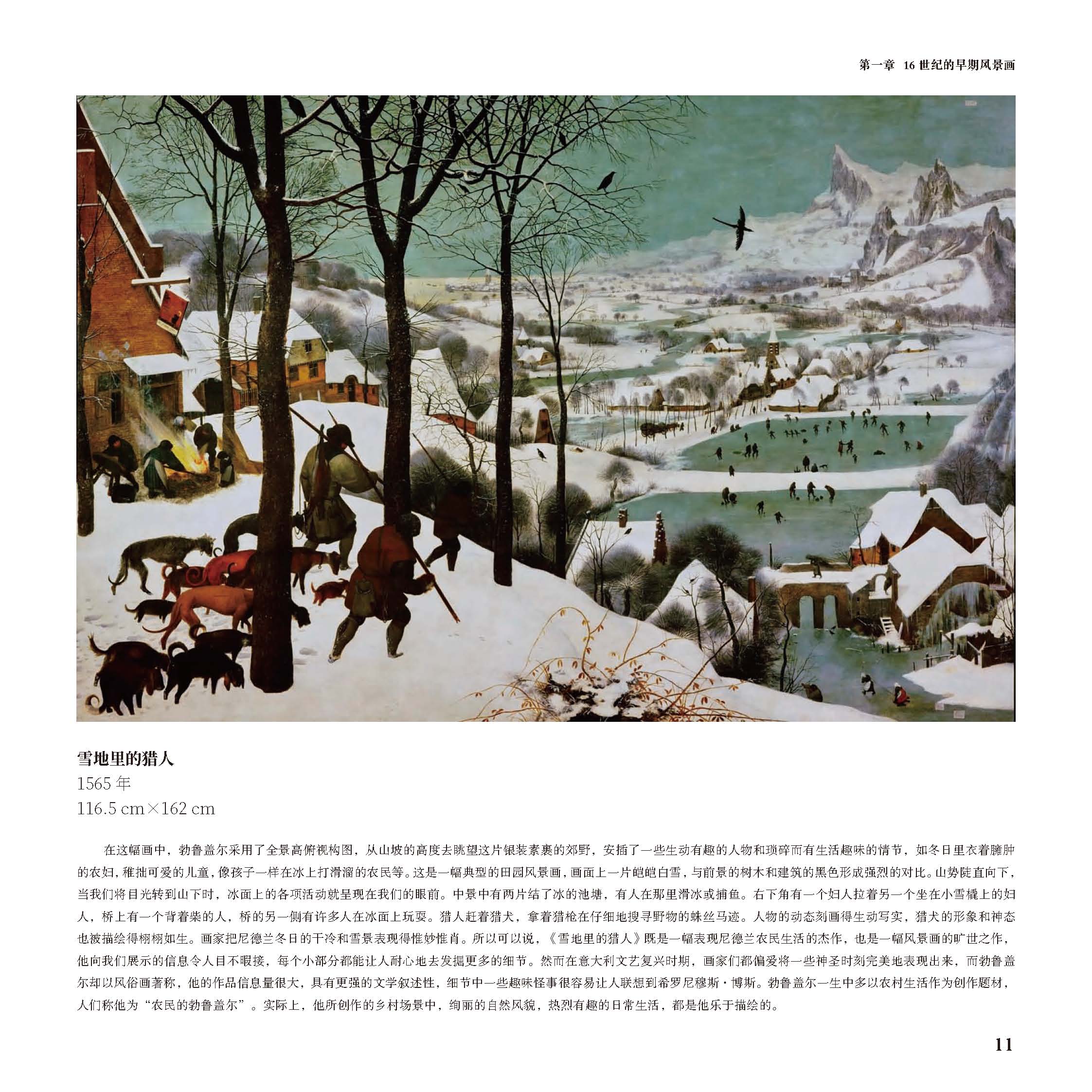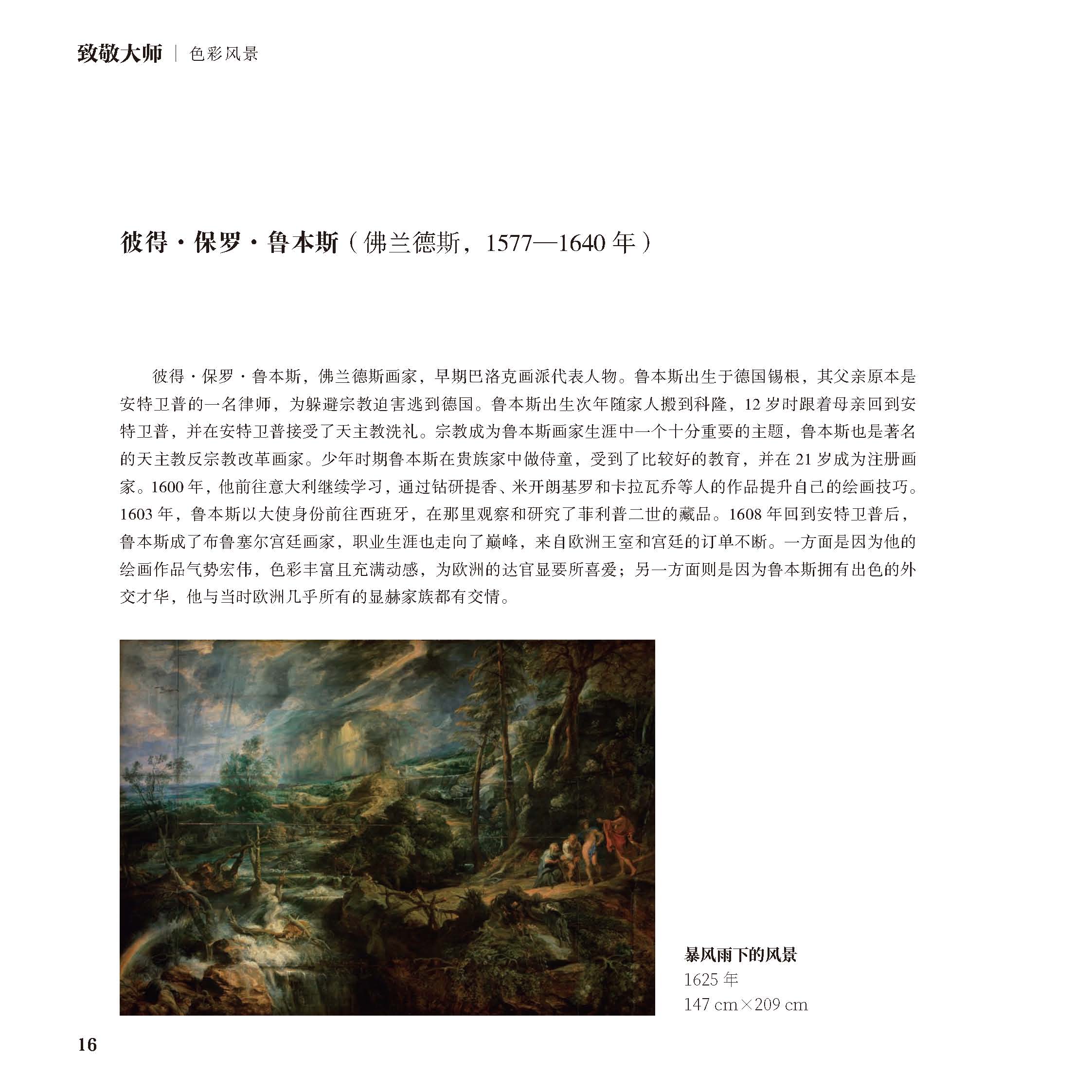 本書呈現(xiàn)的是色彩風(fēng)景部分,從16世紀的早期風(fēng)景畫到后印象派風(fēng)景畫,全書十一章,宏觀呈現(xiàn)各個時期的經(jīng)典風(fēng)景畫作,是藝術(shù)愛好者珍愛的收藏佳品,亦是專業(yè)人士的臨摹工具書。