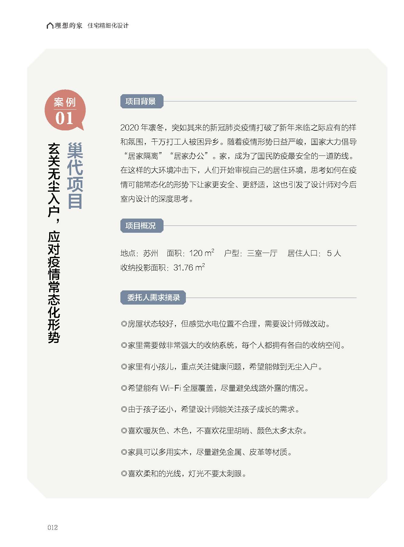 書中將具有代表性的 13 個案例,分別從功能空間、戶型結構、客戶多樣化需求、功能與設計交互四個方面進行系統解讀。每個案例既介紹了項目背景、客戶需求,又闡明了整體設計思路,有方法論,有人情味,有對未來居所的構想,有落地實踐的細節,深入淺出地呈現了室內設計的內涵與外延,相信一定可以為裝修設計者、從業者們提供諸多靈感。