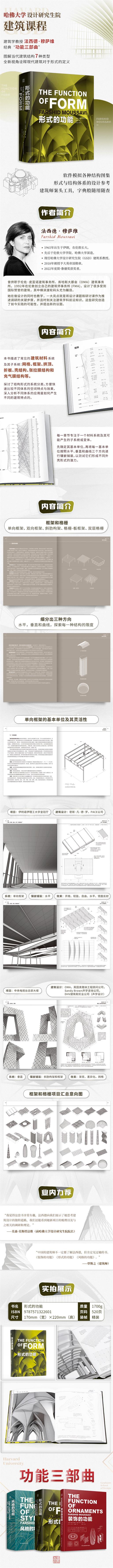 《形式的功能》一書描述了常見的建筑材料系統及其子系統:網格、框架、拱頂、折板、殼結構、張拉膜結構和充氣膜結構等。她首先列舉了每一個結構系統的zui基本形態,隨后每個都細分出三種方向:水平,垂直和曲線,從而來探索每一種結構zui大的限度。在書中,作者對建筑功能和形式之間的歷史關系提出了挑釁性的批評,以揭示現代主義核心的矛盾,認為設計需要擺脫功能的效用定義,形式不僅應考慮建筑物的生產方式,還應考慮其感官表現。
