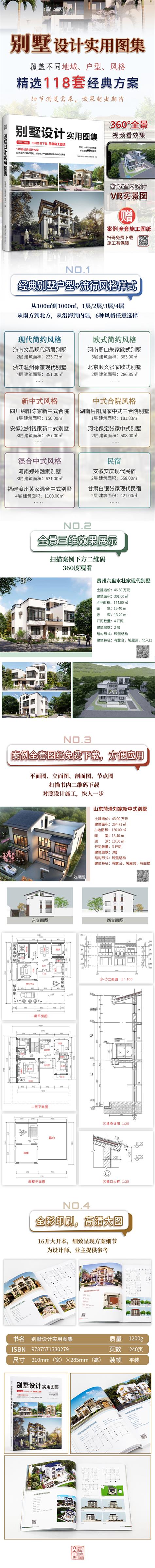 《別墅設計實用圖集》精心遴選118套廣受業主歡迎的經典小別墅設計案例,分為現代、新中式、合院、歐式(簡歐、地中海風格)、中式合院、混合中式和民宿幾種接受度高的建筑風格,通過效果圖、平面圖、立面圖、剖面圖及大樣節點詳圖等多方位的展示,為設計師和準備建造小別墅的業主提供設計和施工參考。同時,書中對絕大部分案例還附有二維碼,讀者掃碼后不僅可以觀看設計方案360°動態效果圖展示,還可以下載更詳細的施工圖紙,直觀易懂、方便快捷。