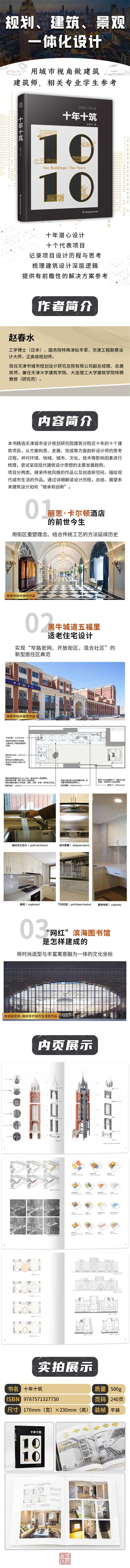 《十年十筑》精選天津城市設計規劃研究院建筑分院十年來的十個建筑項目,并對每個建筑項目的設計歷程進行了詳細解讀。項目分為兩類,一類是繼承傳統風格的作品,如泰安道二號院辦公樓、麗思·卡爾頓酒店(泰安道四號院)、天津職業大學、天津市民族文化宮、黑牛城道五福里、天津市第四中學遷址擴建工程等;第二類是是創造新空間、描繪現代城市生活的作品,如天津圖書館、濱海圖書館、濱海科技館、濟寧市群眾藝術館等。