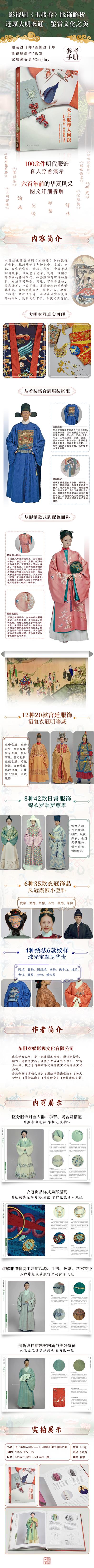 熱播影視劇《玉樓春》給了我們一部分答案。本書梳理了《玉樓春》劇中的服飾,包括皇帝、皇后、皇妃、文官的常服、吉服、戎服、青服等服裝,以及包含發(fā)髻、發(fā)飾、巾帽項(xiàng)飾在內(nèi)的各種配飾,共計(jì)100余件。每件服飾進(jìn)行詳細(xì)分解,對(duì)應(yīng)不同場(chǎng)合、用途、官職和身份,圖文并茂,一目了然。本書在展示衣冠服飾同時(shí),還穿插介紹了明代的婚嫁文化、服飾穿戴方式、禮制習(xí)俗等,讓讀者在欣賞服飾的同時(shí),還能了解大量中國(guó)古代文化常識(shí)。本書可供服飾愛好者閱讀,對(duì)服裝、首飾設(shè)計(jì)師亦有幫助。
