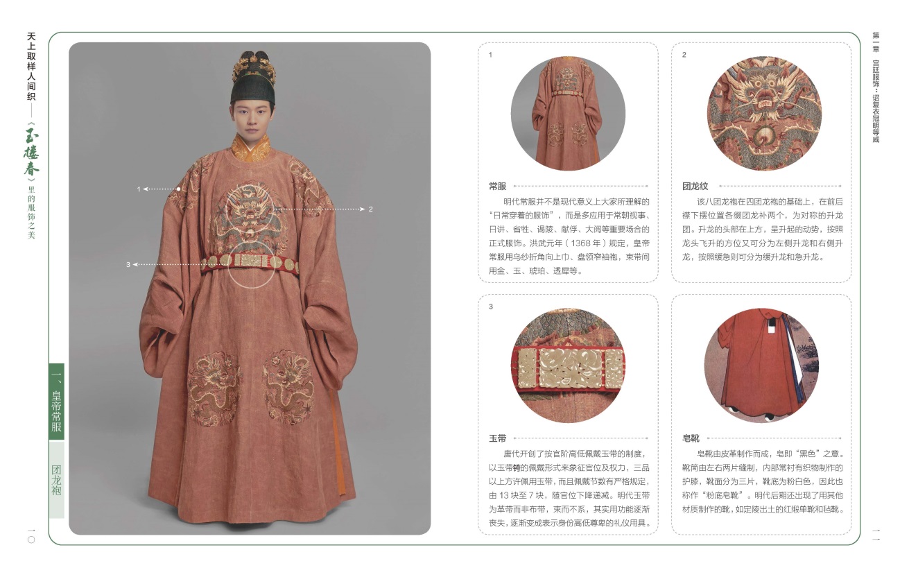 《天上取樣人間織——<玉樓春>里的服飾之美》主要以熱播影視劇《玉樓春》中的服飾為素材,梳理展示了包括劇中的近70種服裝,以及各種不同款式的衣冠、飾品等。書中圖片選取的定妝照服飾,包括皇帝常服、皇后禮服、士庶男子服飾、婦女便服、軍戎服飾等,配以易讀而不失專業(yè)的文字,詳細(xì)解釋不同服飾背后蘊(yùn)含的文化。作者團(tuán)隊(duì)用簡(jiǎn)明易懂的語言,穿插我國(guó)古代服飾的基本知識(shí),將多種服飾的特色和典故娓娓道來,同時(shí)介紹了刺繡、緙絲等“非遺”傳統(tǒng)手藝。書中選取圖片精美,文字優(yōu)美,抒發(fā)了作者團(tuán)隊(duì)對(duì)中國(guó)服飾文化的禮贊。