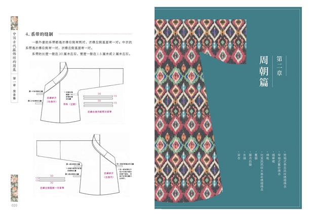 本書(shū)主要展示了周朝、漢朝、唐朝、宋朝、明朝5個(gè)朝代、100套典型服裝的制版圖及現(xiàn)代改良漢服制版圖。如周朝的玄端,漢朝的直裾、曲裾,唐朝的襦裙、半臂、圓領(lǐng)袍;宋代的朱子深衣、披風(fēng);明代的直裰、裙袍等。