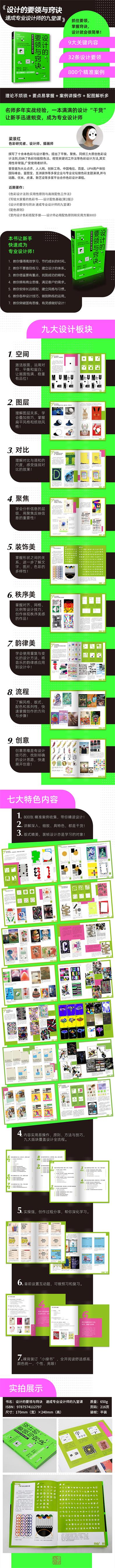 本書分為9章,從9個方面講解初學者應該掌握的設計要領。第 1章從激活版面、留白和重心感3個角度講解空間使用的設計原則;第 2章講解上下圖層的設計原則;第3章從對抗、差異、相似與融合等方式入手,講對比與調和的設計原則;第4章按主要、次要、并列與遞進等關系解析聚焦與傳達的設計原則;第5章闡述裝飾美感的設計方法;第6章從對齊、網格與比例3個角度講解秩序美感的設計方法;第7章則利用聽覺與視覺的通感,解析畫面中富有音樂美感的設計方法;第8章總結了設計流程的操作技巧,即選擇風格、版式、配色與加強細節等;第9章解析設計創意的高級技巧。本書不僅內容精煉,而且圖片精美,提供了數量可觀的設計案例,方便讀者借鑒。此外,本書每章還提供了互動習題,可加強讀者對各章內容的理解。