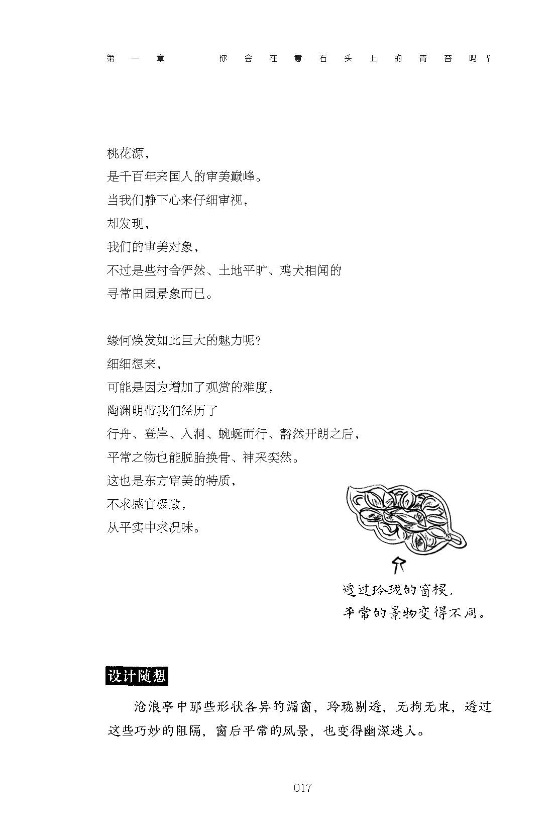 本書的開篇聚焦于古老東方的審美傳統,從古詩文中發掘文人雅士如何運用花、石、草、木等自然材料構建出“方寸之內有乾坤”的庭院景觀,寄托自己的情思與志向。然后將視角轉向庭院營造的邏輯理念,分析其背后隱藏著的房子與自然、與生活之間的關系。再從人類共通的基本需求入手,分析一些古而有之的建筑景觀,現代獨特的藝術設計是如何迎合并滿足這些基本需求的。結尾則選取若干當代知名的建筑師及其設計理念,從細處入手拆解這些理念背后對美的表達方式。