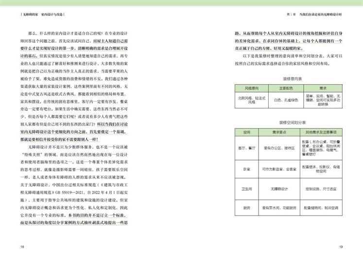 本書分為4章,第一章討論裝修時理清自己的需求,第二章通過室內(nèi)各個空間的拆分,分析如何讓無障礙群體的居家生活舒適自如,第三章介紹智能家居對家居生活的助力,滿足無障礙群體及不同群體的多元化需求,第四章從無障礙設(shè)計拓展到通用設(shè)計及包容性設(shè)計,建議讀者們立足當下,未雨綢繆。