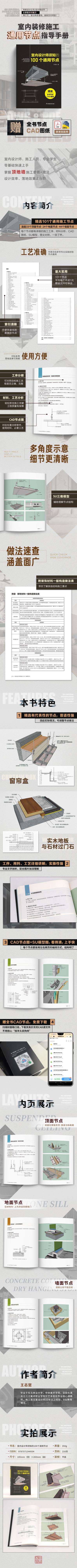 本書共分為三章,總共100多個節點:第一章介紹35個頂面節點,比如輕鋼龍骨吊頂、木飾面吊頂、空調風管、石膏板多疊級棚面、玻璃燈箱等的節點用料及工藝分析;第二章介紹27個地面節點,比如地磚鋪貼、地熱、沐浴間石材內下水槽、推拉門地思等的節點用料及工藝分析;第三章介紹42個墻面節點,比如輕鋼龍骨隔墻工藝構造、實木掛板、輕體墻及木飾面與石材踢腳線、復合墻板與白鋼包口線等的節點用料及工藝分析。每個節點有解析,解析包括施工工序、工料分析兩部分,有CAD圖紙,還有SU模型圖,圖文配合說明,讓讀者對節點結構、工藝一目了然。