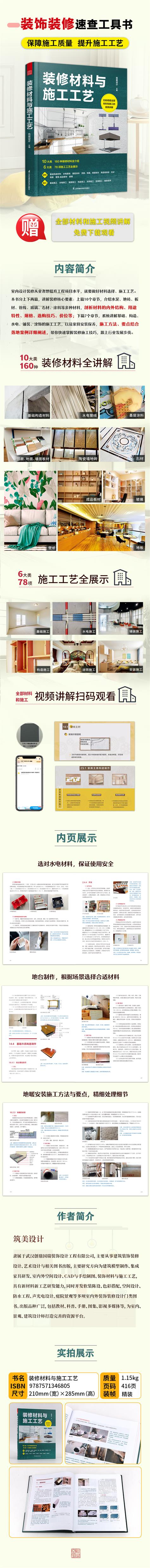 本書分為上下兩篇,上篇為裝修材料的介紹,下篇為施工工藝的講解。上篇10個章節,介紹了室內裝修時用到的水泥、地磚、板材、管線、玻璃、石材、涂料等等多種材料,剖析材料的內外結構、特性、規格、選購技巧,讓讀者對裝修材料有深入的認知。下篇為7個章節,介紹了基礎、構造、水電、鋪裝、涂飾的施工工藝,以及家具安裝和保養的技巧。本書堅持理論與實際案例相結合,幫助讀者快速掌握裝修選材技巧和施工工藝。本書寫作歷時六年,總結了作者近20年來完成過的53項大型工裝與200多項住宅工程,搜集各類裝飾材料樣本1600余件,將一線室內裝飾經驗匯集于此,望有助于推動室內設計行業的發展。