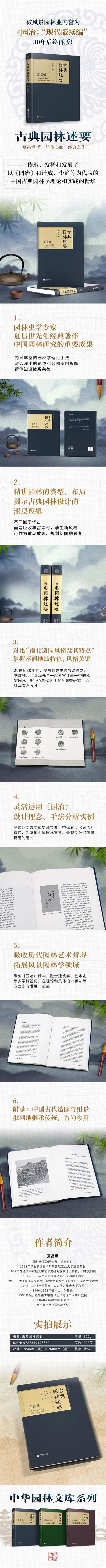 夏昌世教授于1995年出版的《園林述要》一書,被業界堪稱為《園冶》的“現代版續編”。本書在《園林述要》的基礎上重新整理,傳承、發揚和發展了以《園冶》和計成、李漁等為代表的中國古典園林學理論和實踐的精華。