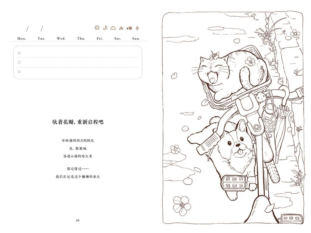 《可愛萌物:一本愉悅心靈的輕填色書》全書分為四個章節(jié)“貓貓狗狗會看家”“蝴蝶停在鼻尖上”“荒野王國歷險記”“奇幻夢境幻想詩”,由家中到動物王國,再到幻想世界,不僅是對可愛形態(tài)的捕捉,更是對純粹快樂與無羈想象的情感描繪。每一章都配有相得益彰的靈動小詩,讓文字與畫面共同呼吸。插畫場景細膩溫馨,線條柔和,無論你是渴望減壓的成人,還是心懷童話的讀者,都能在此提筆著色,找回那份質(zhì)樸的驚喜與感動。每個章節(jié)包括1張跨頁填色大圖頁和12張?zhí)钌?手賬頁和若干自由填色頁,以及計劃頁、打卡頁等氛圍感手賬設(shè)置。