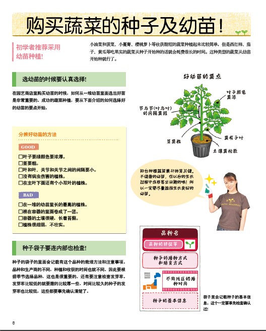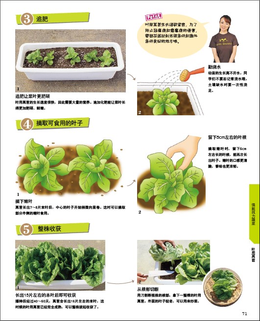 28種蔬菜的陽臺栽種方法,播種、澆水、打叉、收獲每一步都有實景照片,每種蔬菜配備栽種小月歷和護理小貼士,可操作性極強。