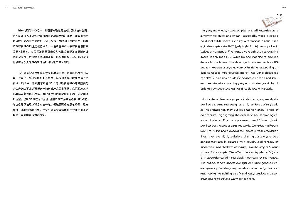 這本書圍繞建筑立面材質(zhì)——塑料,從材質(zhì)歷史、代表案例兩方面,介紹了材質(zhì)的理論和實踐。大量精美的手繪稿和細節(jié)圖片,以及詳盡的圖注最直觀地為您提供立面“個性化設計”的方案。讀者可以以極大的興致和輕松的氛圍全面領略建筑界的這場“時裝”運動。
