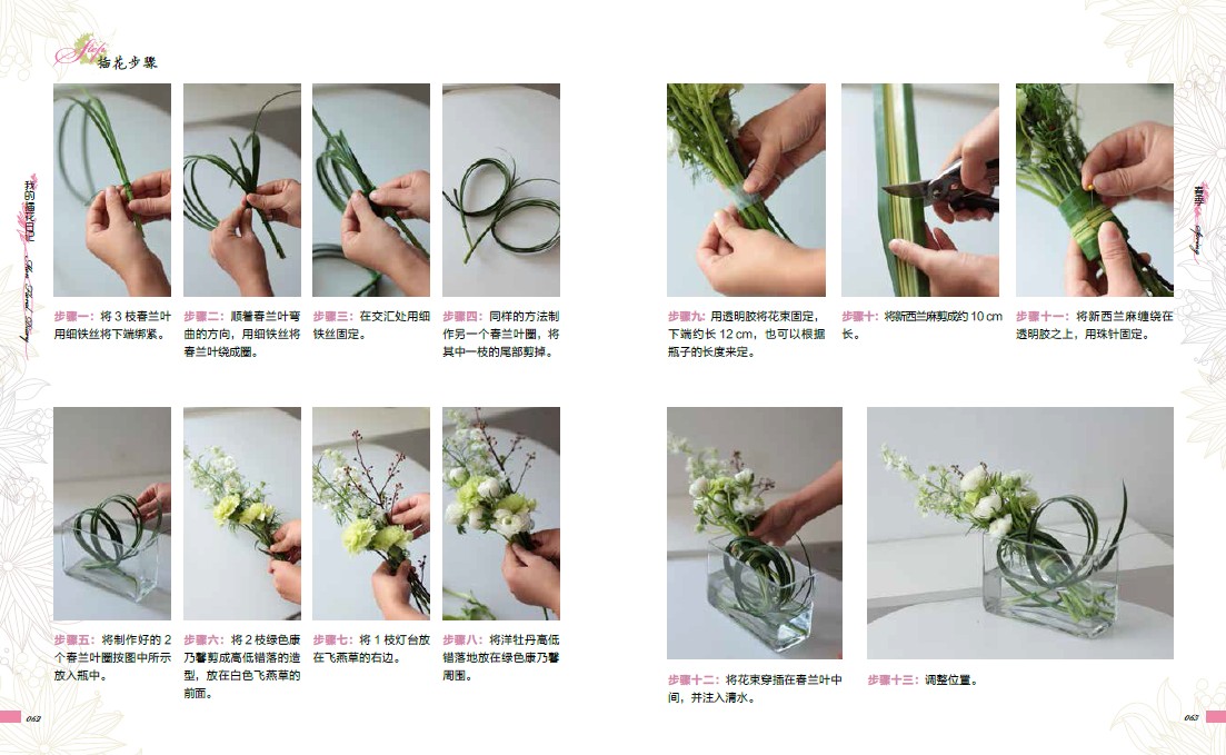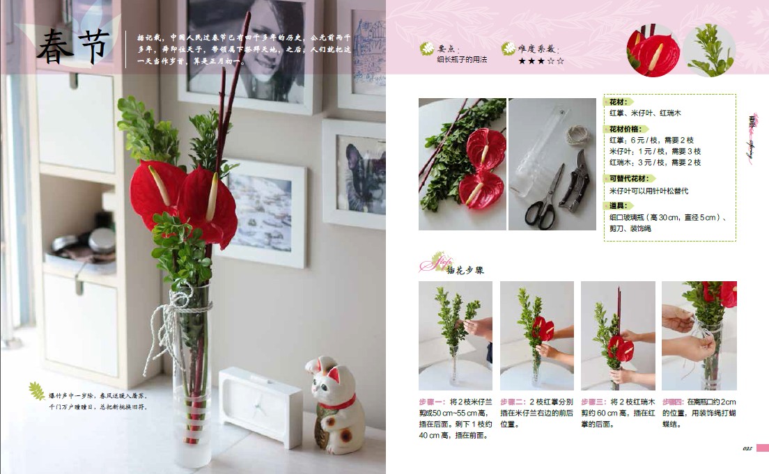 本書以時間為軸線,一年對應(yīng)不同的季節(jié)和節(jié)日,每個新創(chuàng)意都能讓讀者萌生插花的念頭,常見的花材和簡單的操作讓讀者容易上手。分為節(jié)日花藝和日常插花。每個插花都配有詳細的步驟講解和圖片。節(jié)日花藝會根據(jù)不同的季節(jié)選擇當季花材,搭配節(jié)日的氛圍,更好地烘托節(jié)日氣氛。日常插花以簡單裝飾為主,應(yīng)用形式多樣,包括插花、浮花、手花等形式。